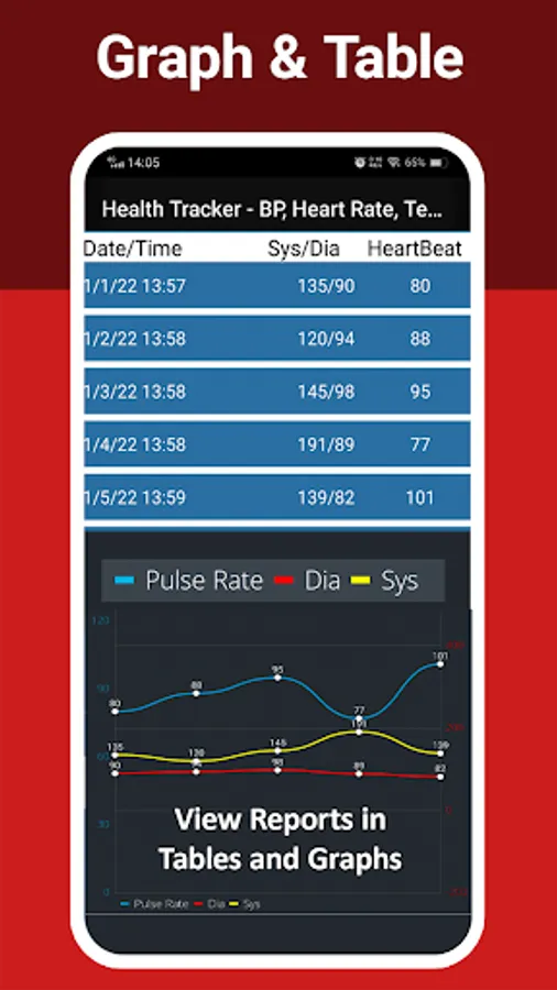 Keep track your systolic and diastolic blood pressure and pulse rate anytime. Save these report in tabular view, list view and graphical view in jpg and pdf format and share with anyone. You can monitor, analyze and improve your health care with the health tracker app.