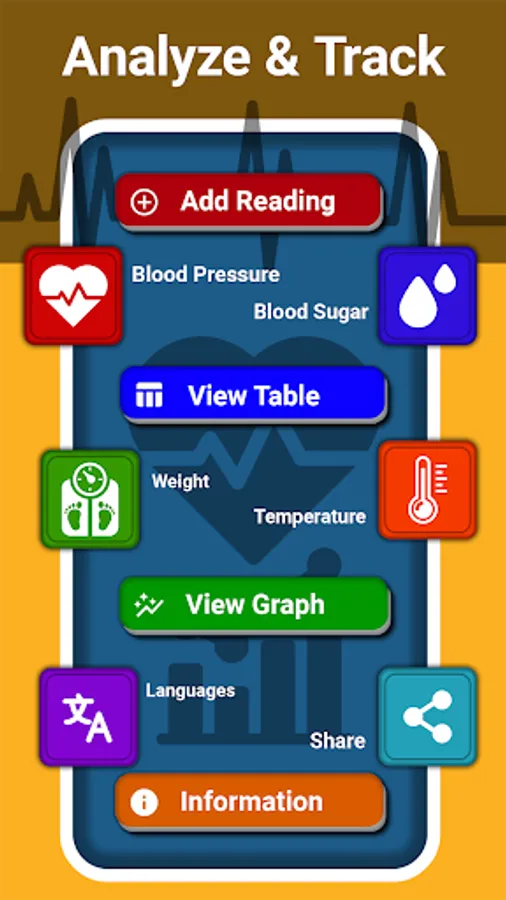 • Monitor your blood pressure, weight heart beat rate, temperature and blood sugar with health tracker app