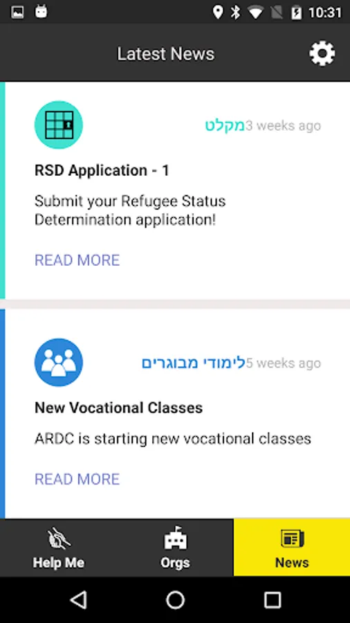 In addition to frequently asked questions and answers, Salaam provides news relevant to asylum-seekers on the news feed tab with the most up-to-date news items on top, and push notifications for news that is important, time-sensitive, or urgent. Salaam also provides convenient access to emergency phone numbers, and the contact information, location, and reception hours for organizations providing services to asylum-seekers and refugees in Israel.