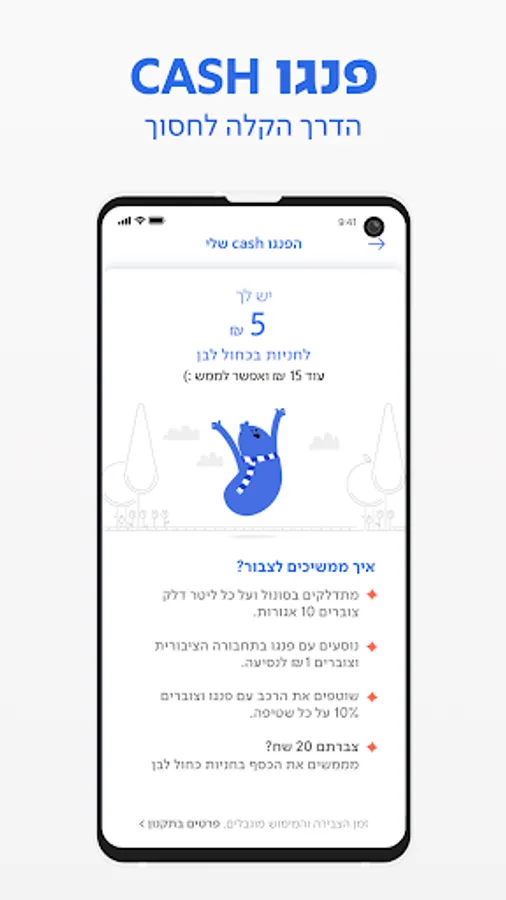* Pango Cash - collecting cash for parking spaces in blue and white. 1 NIS for every trip by public transport, 10 NIS for every liter of fuel at Sonol stations, 10% of the cost of washing.