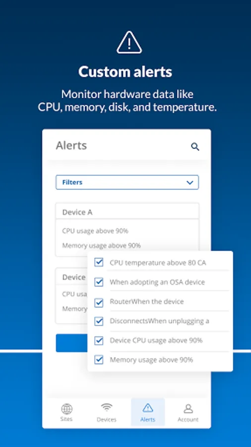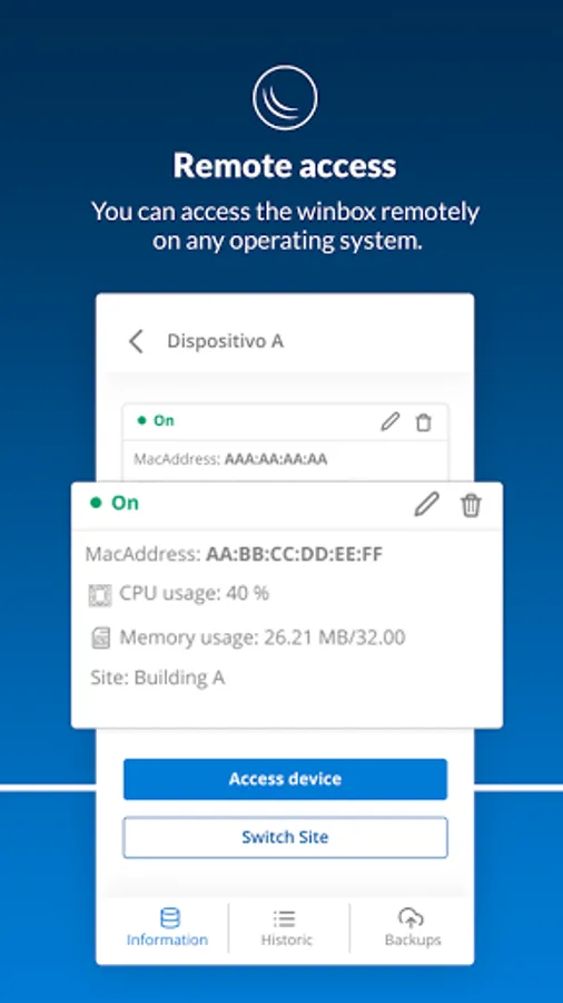 Easily access your Mikrotik routers to configure Vlan, Bridges, Firewall, check DHCP, perform speedtests or just take a look at your Wi-Fi. You also will be updated on the status of your devices in real time, receive alerts when your device goes offline/online, monitor hardware and network data and all with predefined templates, automatically applied for you.