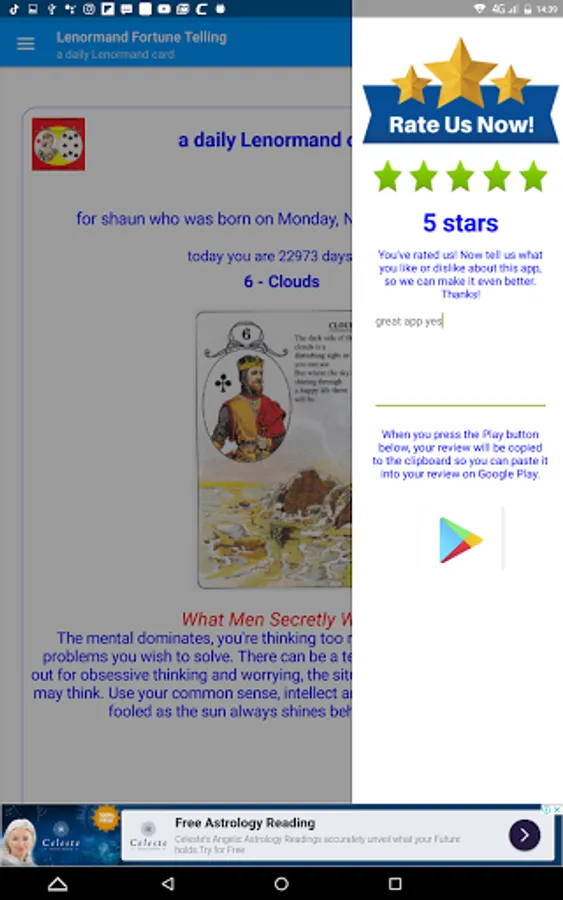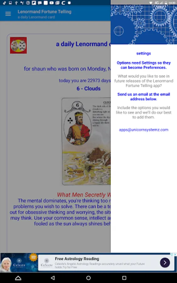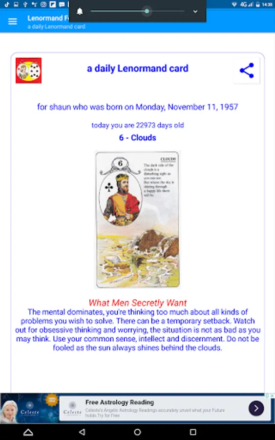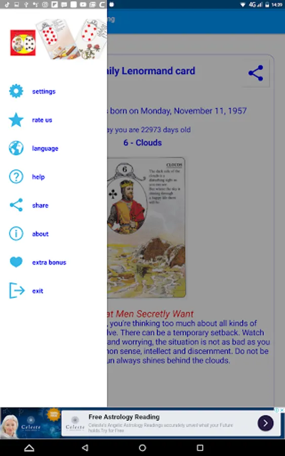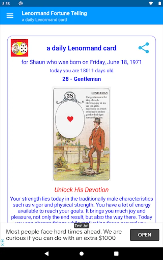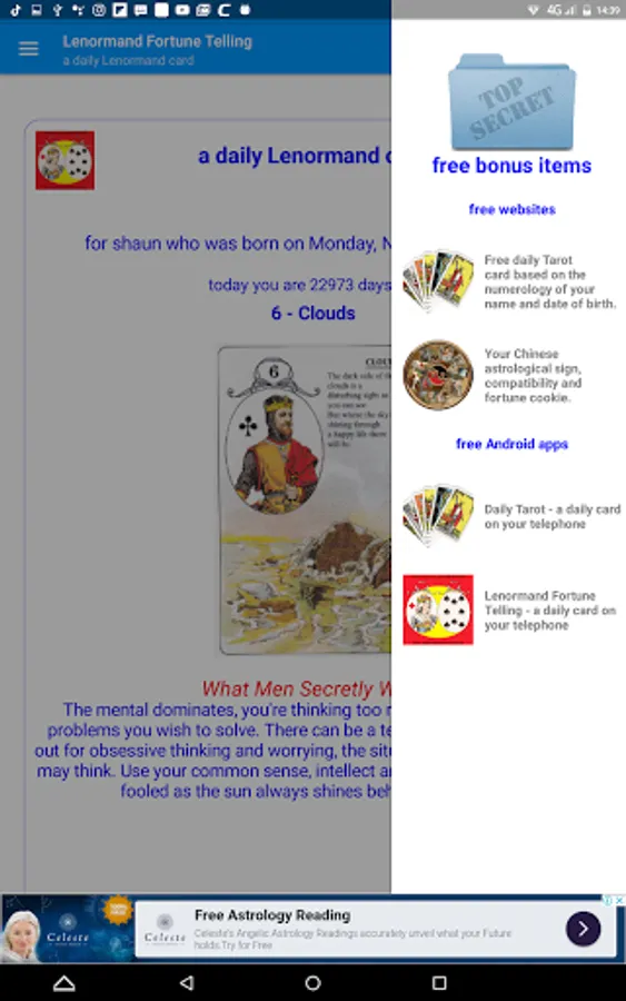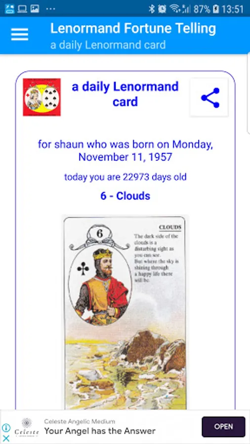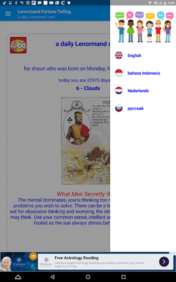 Each day, receive one card with a complete description of what that card means for you that day. Card texts were written in Dutch by the world famous card reader and scholar, Renée Merkestijn.
