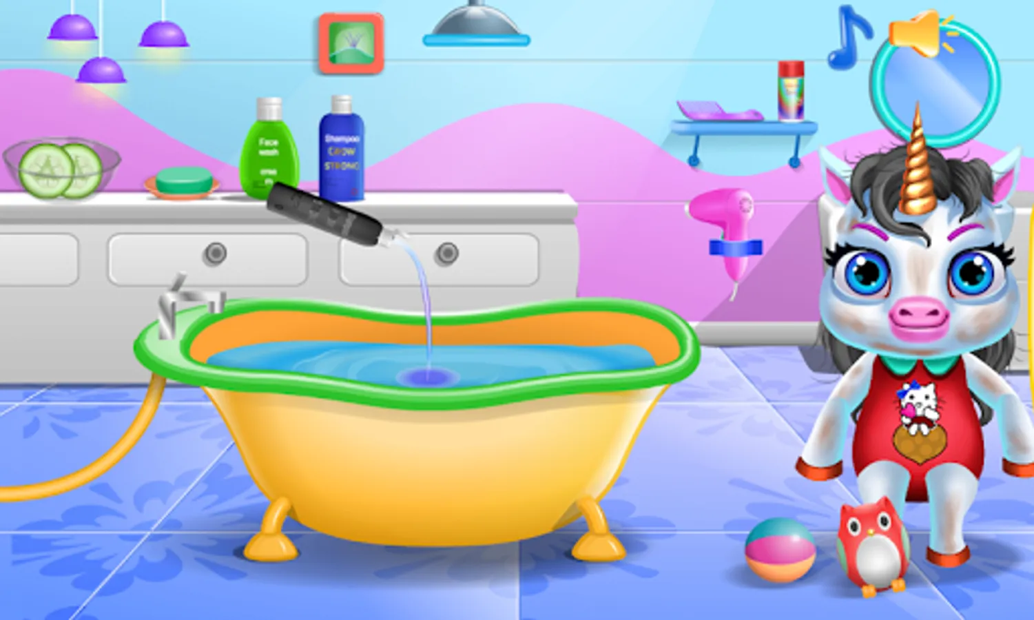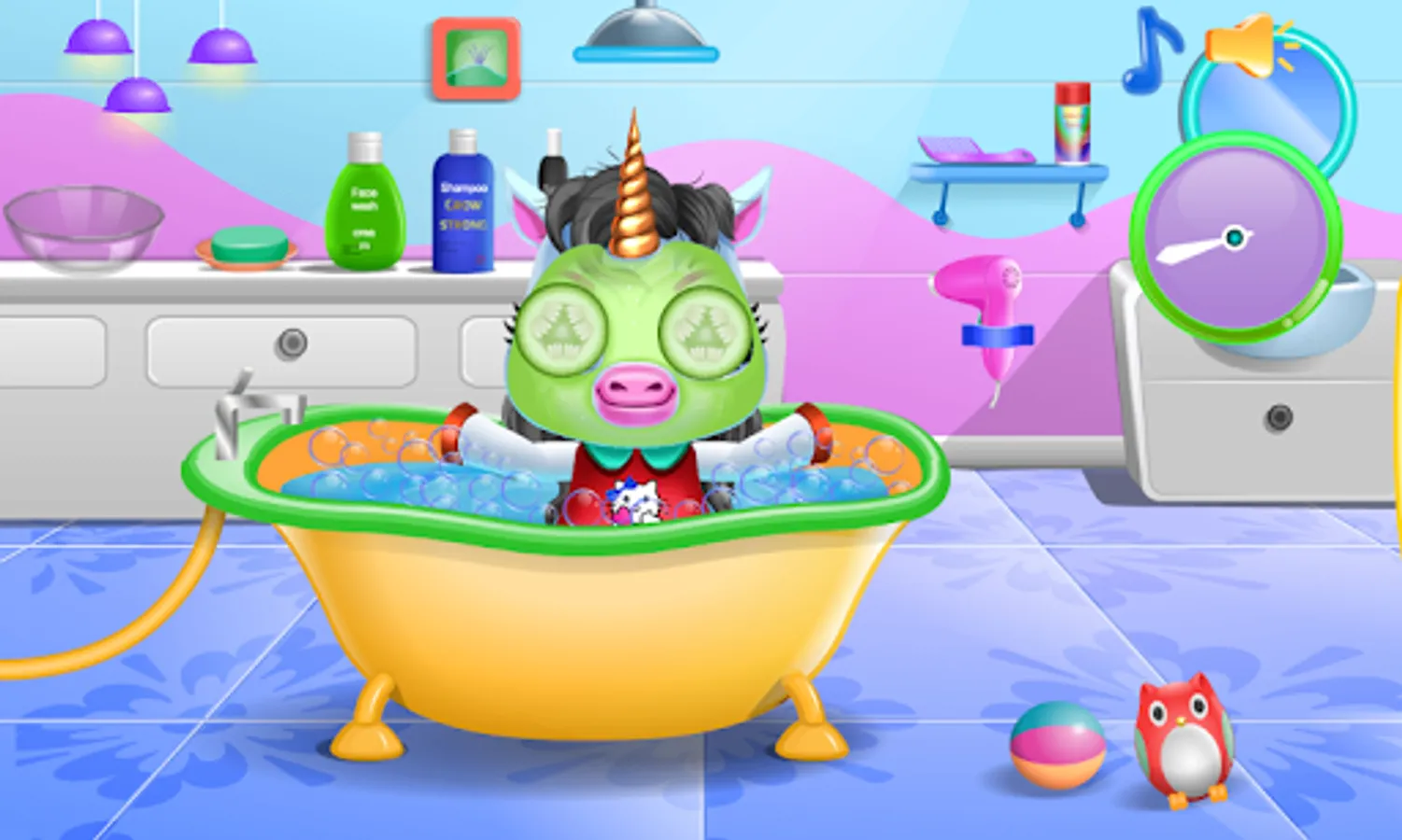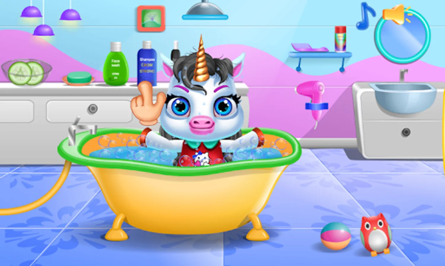 - Unicorn pony cleaning: clean up the filly by placing it in the bathtub and applying detergent, put shampoo over its head, after that