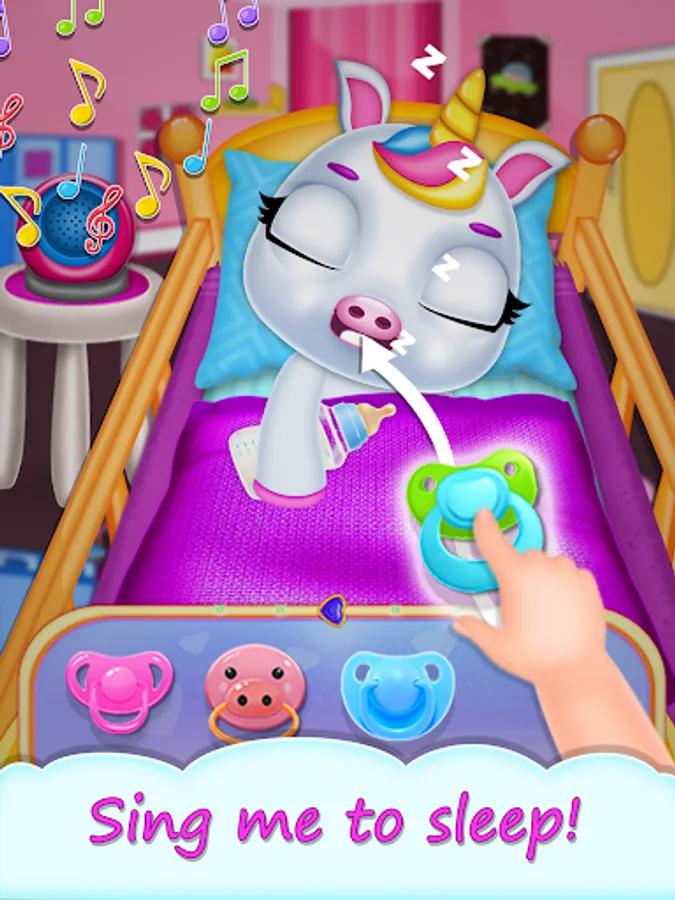 Feed your "baby unicorn" fun and yummy foods: fruits, veggies, cakes, donuts ! Give a squishy toy to your "baby unicorn" and sing the little one to sleep with nice songs ! Sweet dreams, baby unicorn.