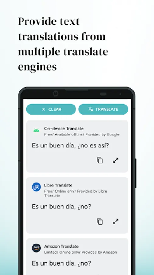 • Access text translations from multiple engines to ensure accuracy and consistency
