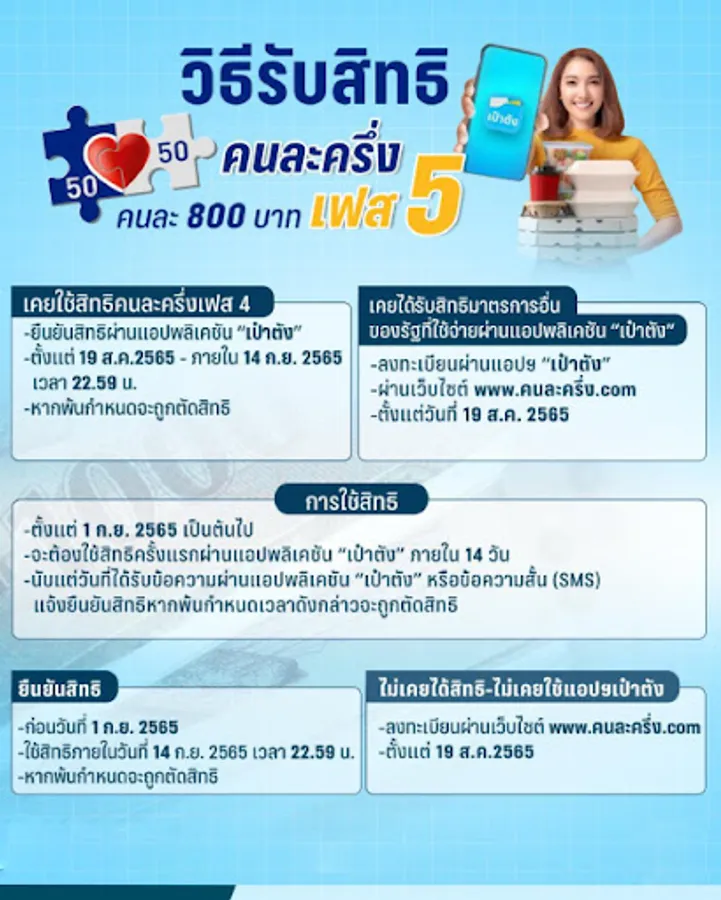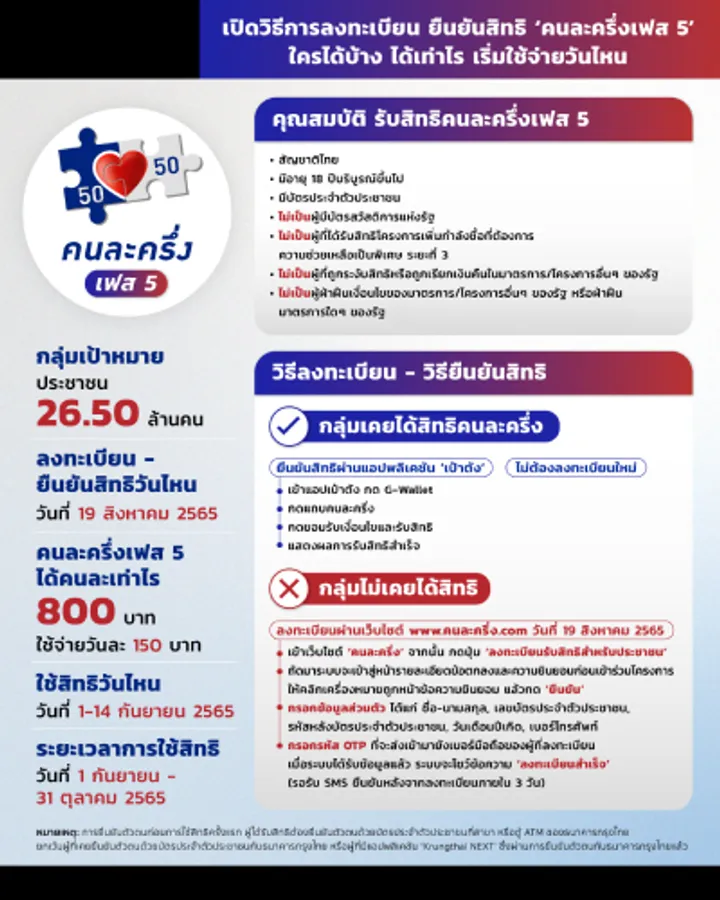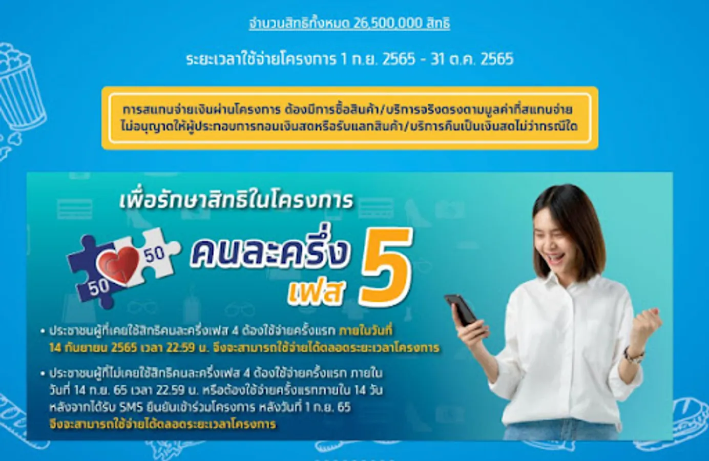 This application is not a registration application. half-person project It will only help to introduce important information and knowledge in obtaining the rights of the project, such as how to get permissions. When can you start spending on products, etc., the government will pay for food, beverages, specified products and services at a rate of 50%, not exceeding 150 baht/person/day or not exceeding 800 baht/person throughout the project period. Will receive money from September 1 - October 31, 2022