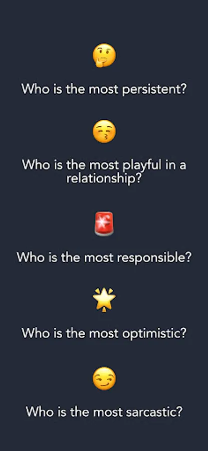 Here's how it works: First, create your profile and add your friends. Then, answer a series of questions about your friends, such as "What is their favorite movie?", "What is their biggest fear?" or "What is their go-to snack?". Finally, select the statement that fits your friend best. It's that easy!