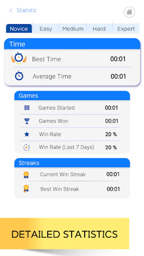 ● Statistics: Track your progress for each difficulty level: analyze your best time and other achievements.