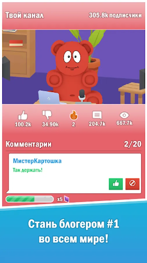 Become the new internet celebrity in Valerka: Blogger Simulator! In this clicker, every tap on the screen makes the channel of the bear Valerka closer to world success. Help Valera make a successful blogging career and build a huge fan base!
