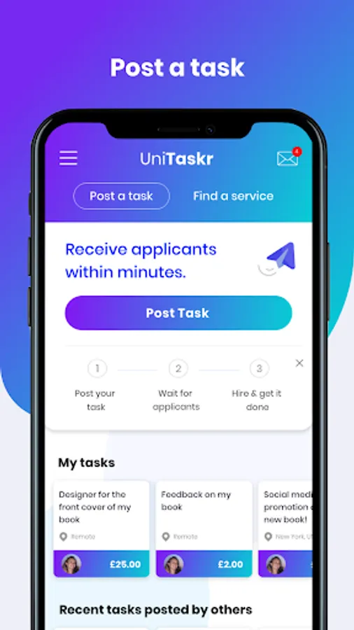 UniTaskr will allow you to explore and adapt on skills you may have whilst becoming financially independent throughout your studies. No more late night bar jobs with inflexible hours and difficult bosses. Choose your own tasks, own hours and own wage. Upon signing up you will be asked to set task alerts, this way once a task is posted we can notify you straight away. Build up your ratings and reviews to attract more work.