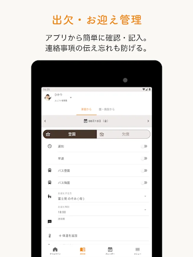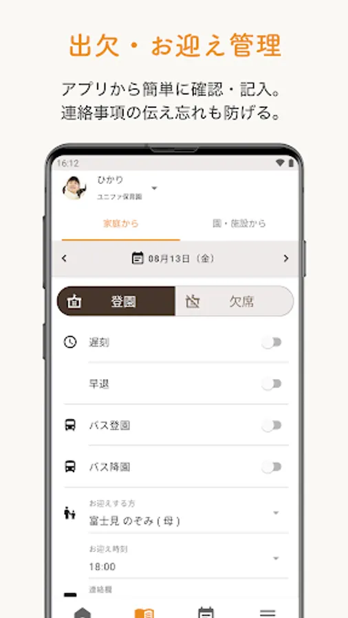 By linking with the kindergarten attendance management system "Lukmi attendance", in addition to stamping on the tablet of the kindergarten and facilities, you can also stamp the time of arrival and departure with the "Lukumi for FAMILY" app. It is non-contact and hygienic because it can be stamped from each guardian's smartphone.