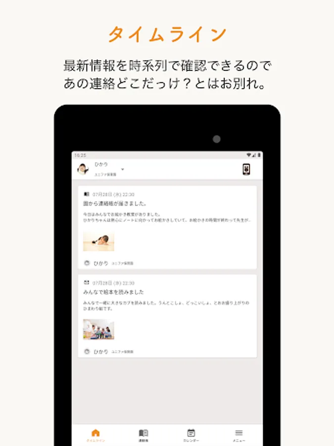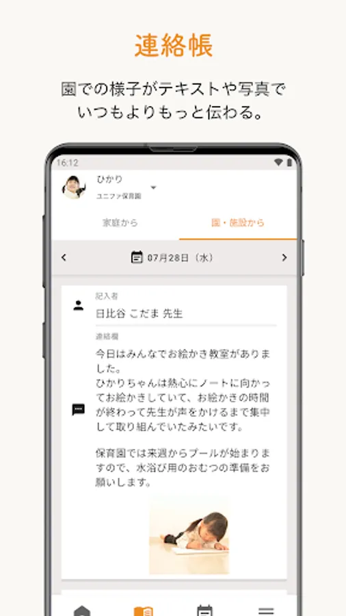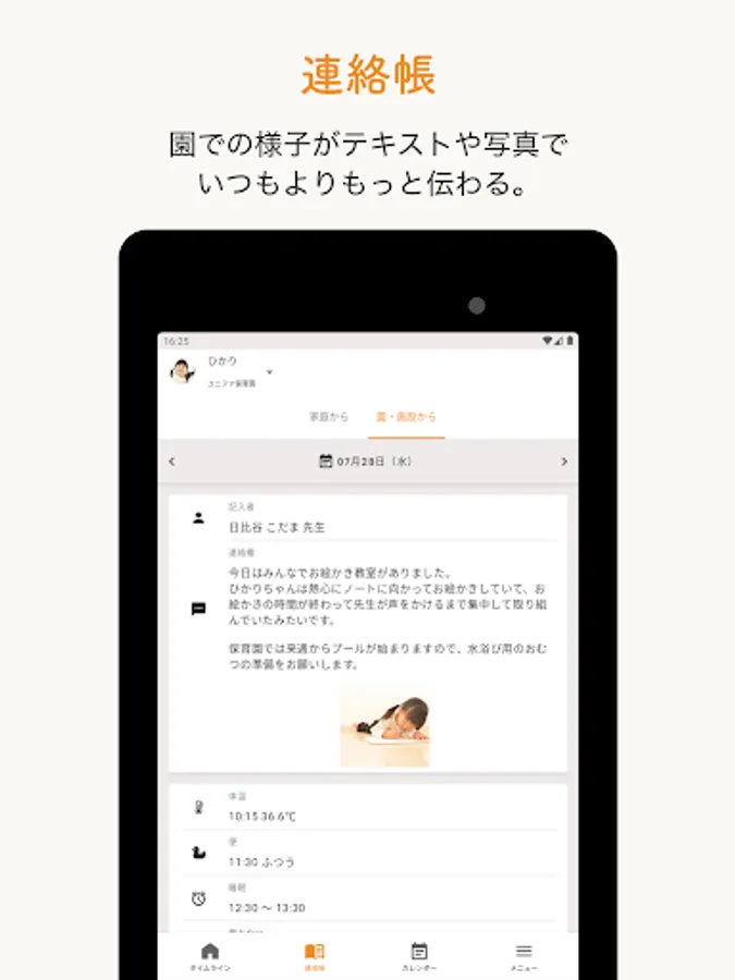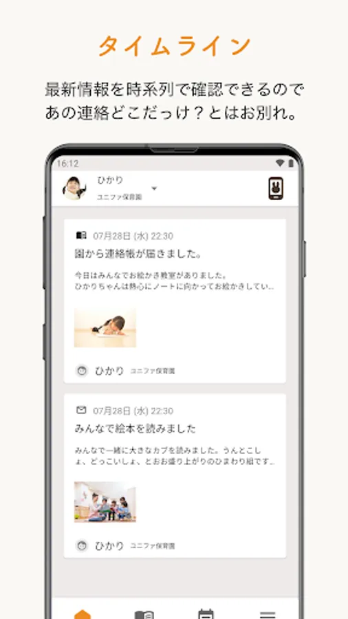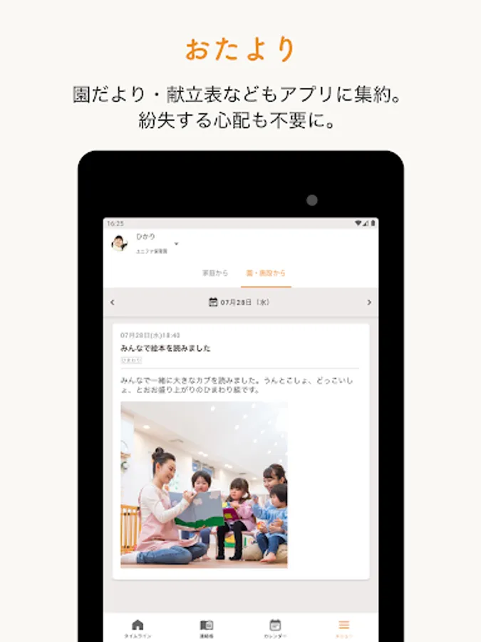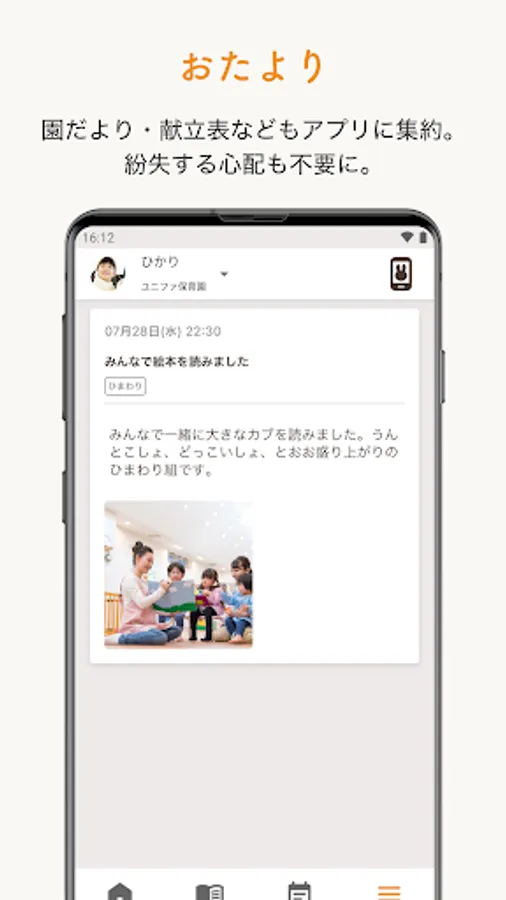 You can check news from the kindergarten, such as school lunch news and health news, on the app. Data can be exchanged, so you don't have to worry about losing it.