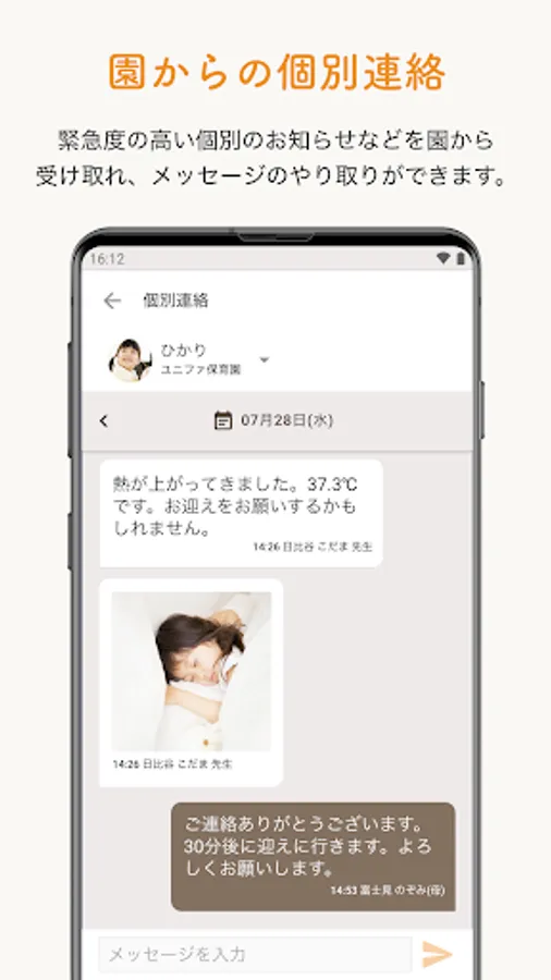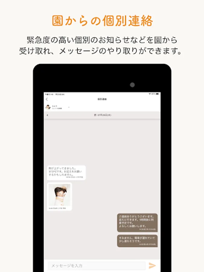 You can communicate with the garden in a chat format. With this function, you can contact the nursery school when you suddenly have a fever or ask questions about the next event, without worrying about whether or not the phone will be connected.