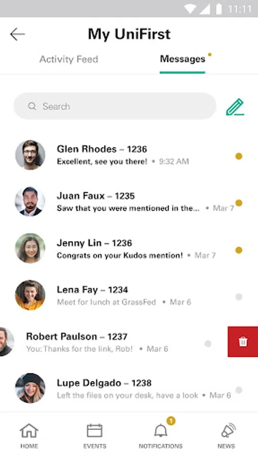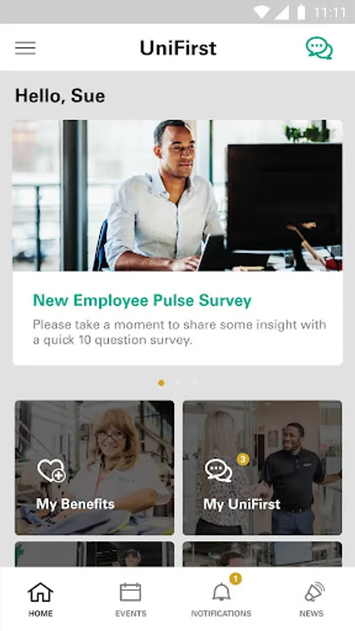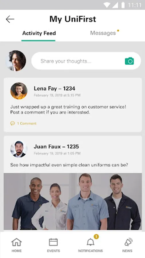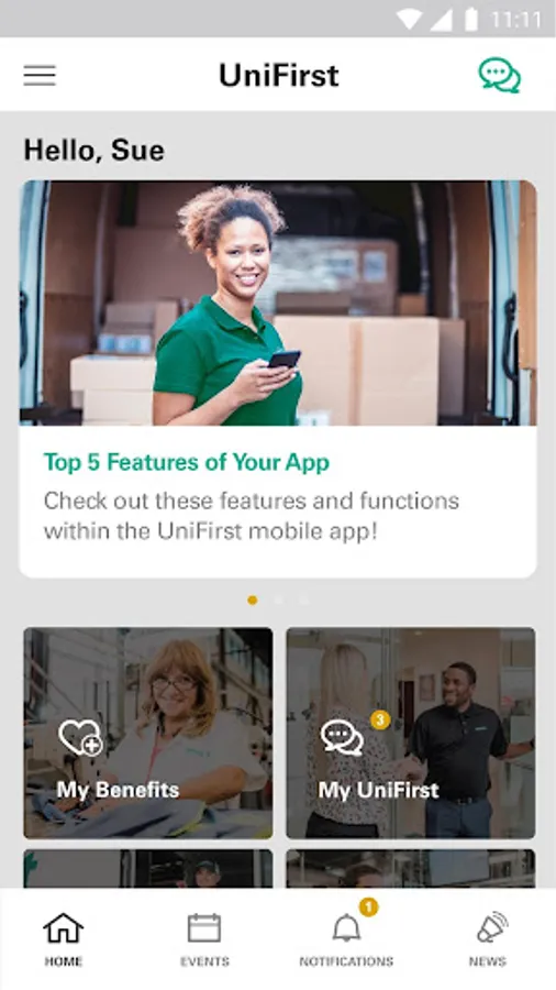 The UniFirst Communications app allows Team Partners to stay connected to UniFirst by providing access to news, events, a social wall, and other important information. U.S. Team Partners can also view details about their UniFirst benefits, including access to personalized plan information, carrier contacts, a digital ID card wallet, and much more.