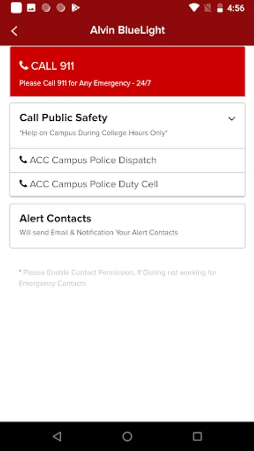 The Alvin BlueLight app allows you to easily contact ACC Campus Police Dispatch and ACC Campus Police Duty Cell in the event of an emergency. It also allows you to setup emergency contacts other than Campus Police that you can alert in an emergency.