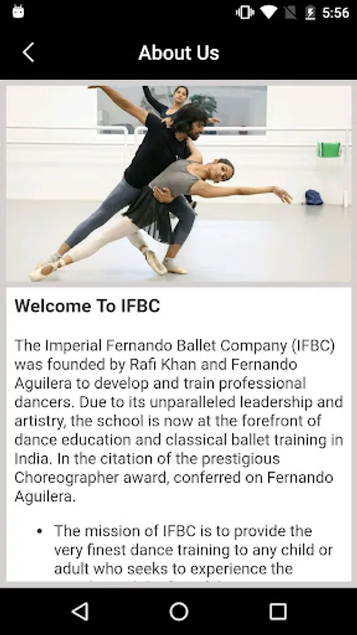 The Imperial Fernando Ballet Company (IFBC) was founded by Rafi Khan and Fernando Aguilera to develop and train professional dancers. It is an effective source of information about dance education and classical ballet training in India. The App provides online registration of the ballet classes across India. As a user you can view the studio locations, admission procedure, workshop details, class schedules, gallery and other useful information about The Imperial Fernando Ballet Company as well as pay online for the classes you wish to enrol in. Other features of the app include attendance, timetable, events etc.
