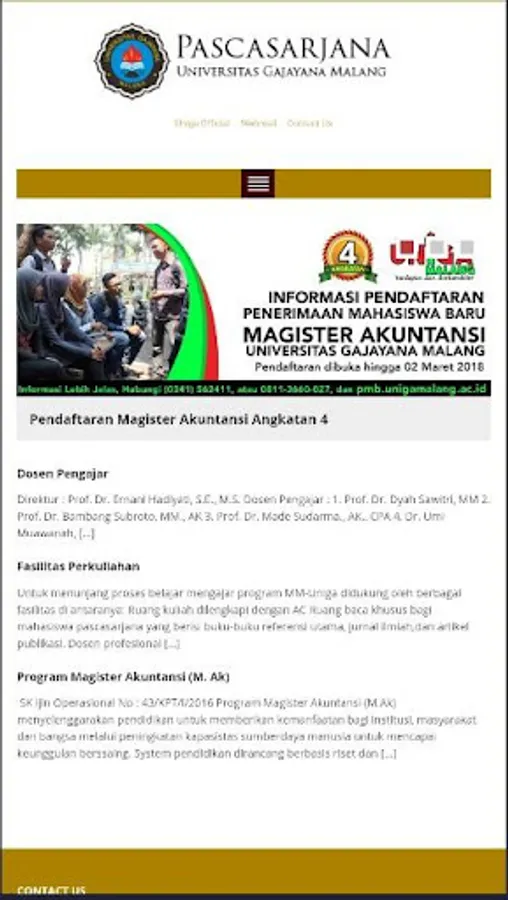 At present, in its journey, Gajayana University has 3 (three) faculties, namely the Faculty of Economics and Business, the Faculty of Engineering and Informatics, and the Faculty of Social and Cultural Sciences. In addition there is a Postgraduate Program that is the Masters Program and also the Accounting Professional Program (PPA).