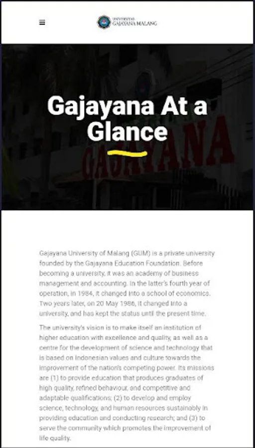 At the age of 34 years, Gajayana University has 3 faculties and 11 (nine) study programs and has graduated 9160 consisting of 8420 Bachelor (S1) and 740 Postgraduate Programs (S2) in its development we always carry out development and renewal according with the vision and mission of higher education.
