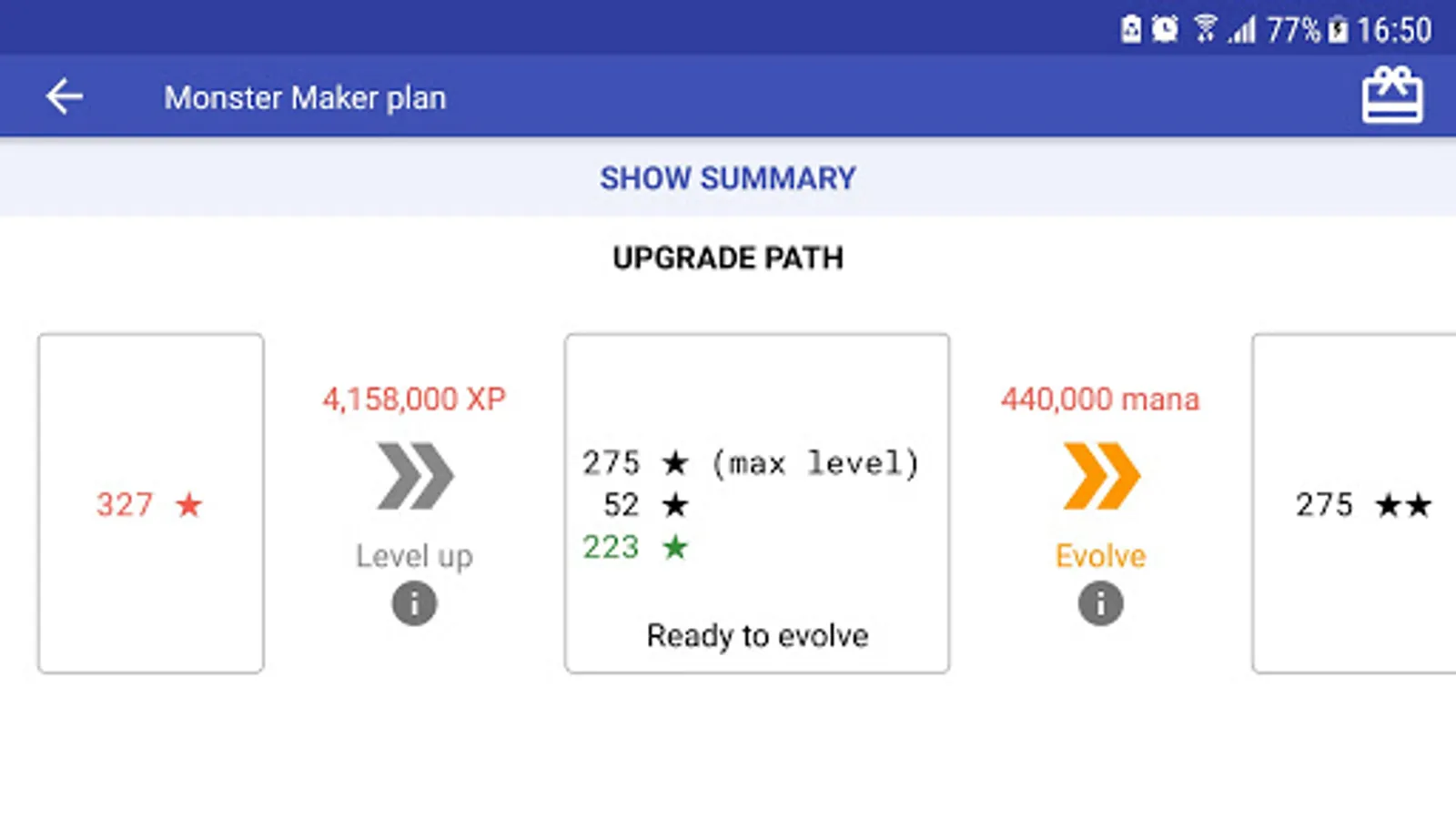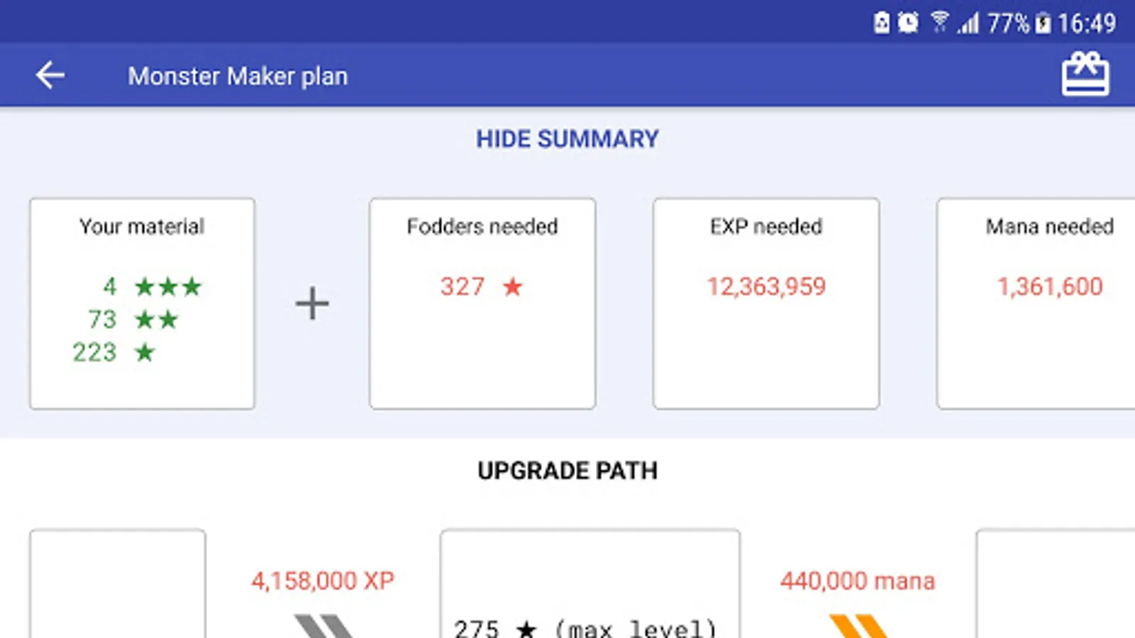 ★ Visualize number of fodders/Xp/Mana needed to powerup/upgrade monster's grade.