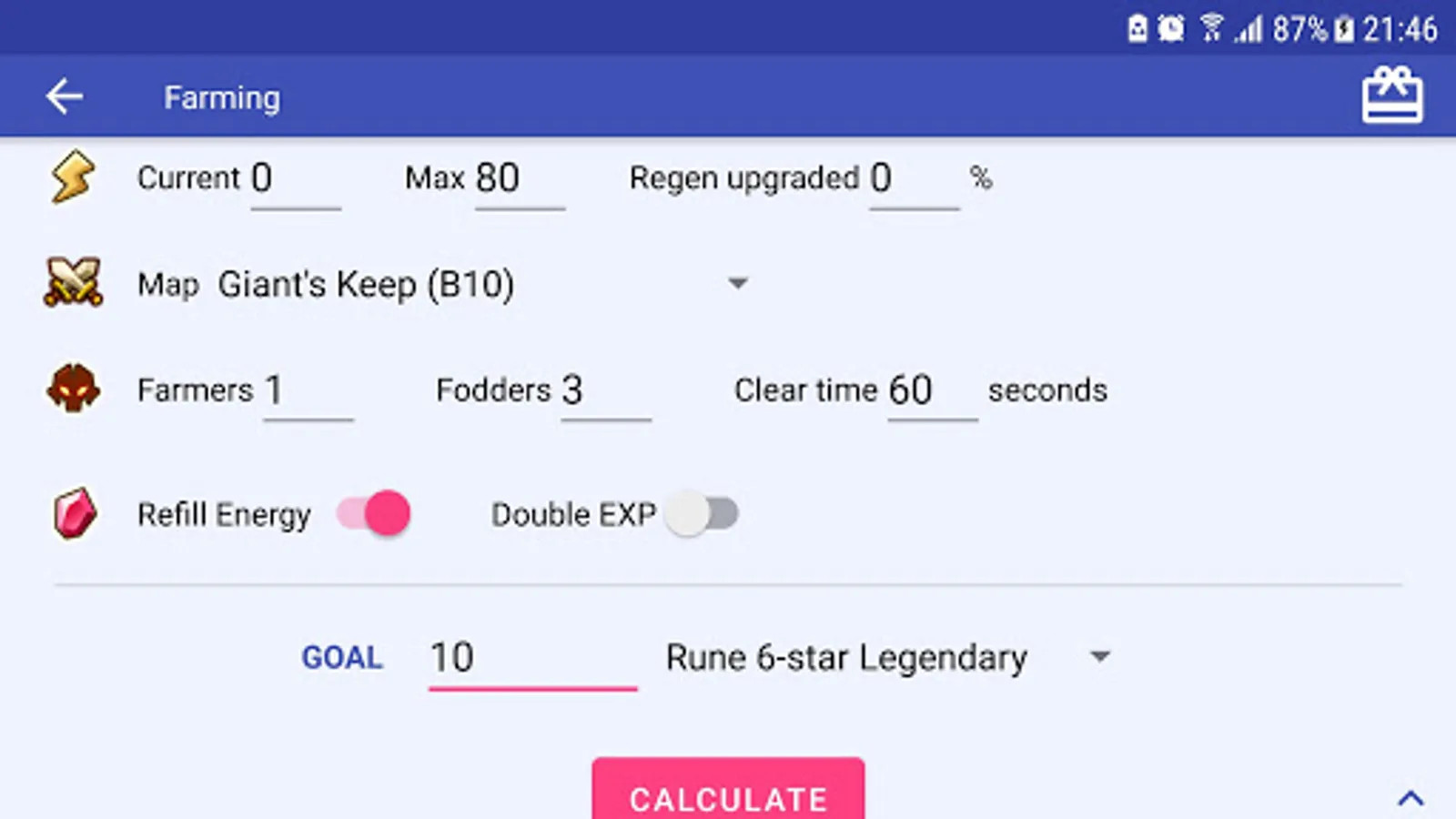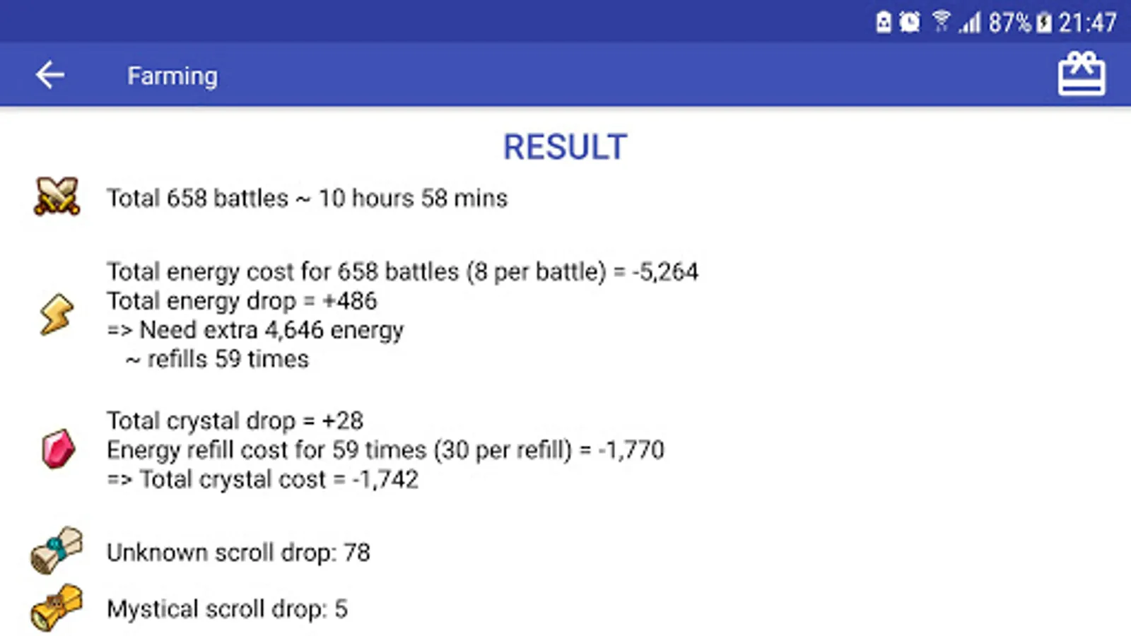 ★ Calculate the cost of Energy/Crystal/time to grinding and obtain an amount of EXP/Mana/Essence/Rune.