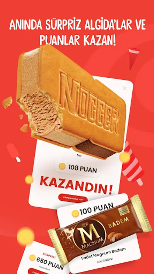 Seçili Algida ürünlerindeki kodu girerek anında sürpriz Algidalar ve puanlar kazanmak, biriktirdiğin puanları istediğin gibi harcamak var!