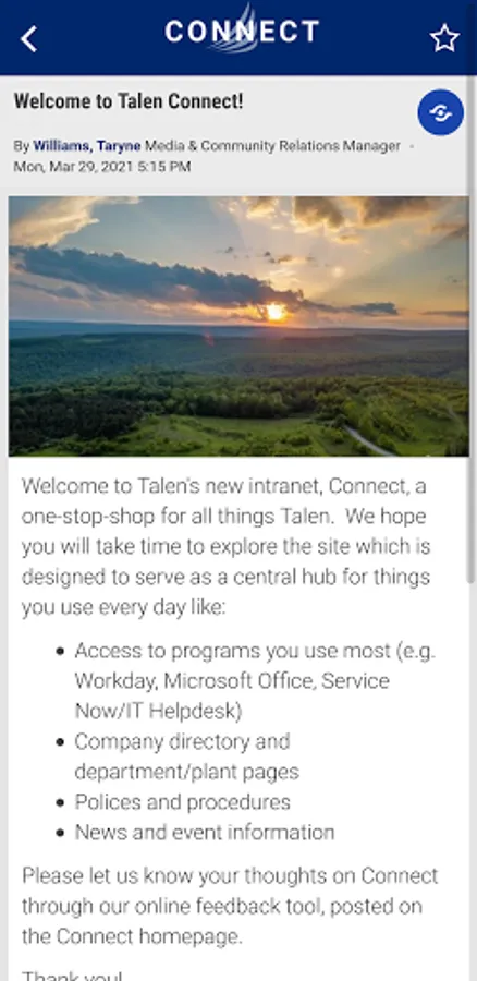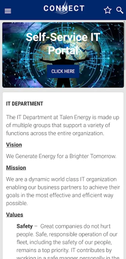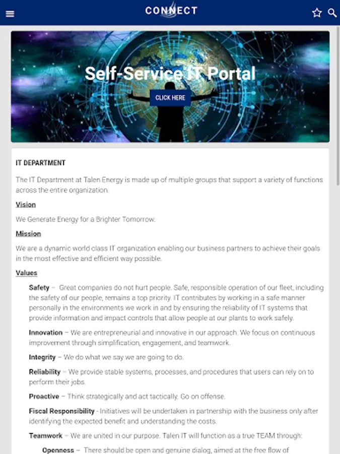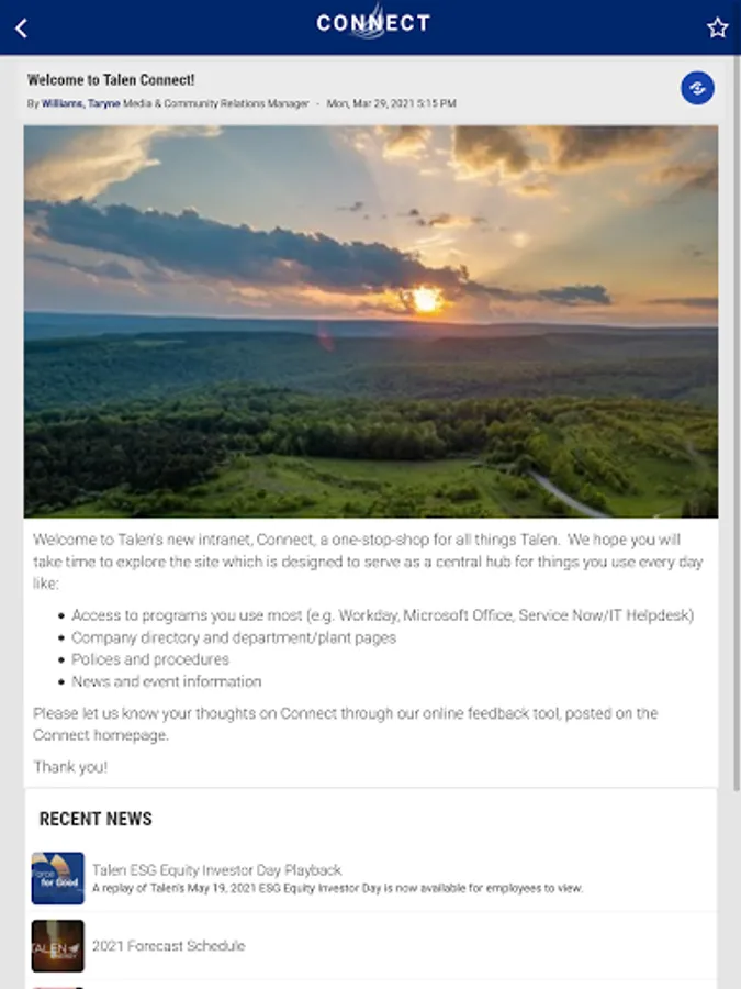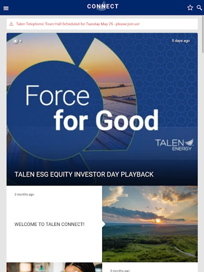 Talen Connect mobile is the full-featured app version of Talen Energy’s corporate intranet. Employees and contractors of Talen Energy Corporation can access the site through the app to view news and information, connect with company programs and tools, and connect with individuals, departments and groups.