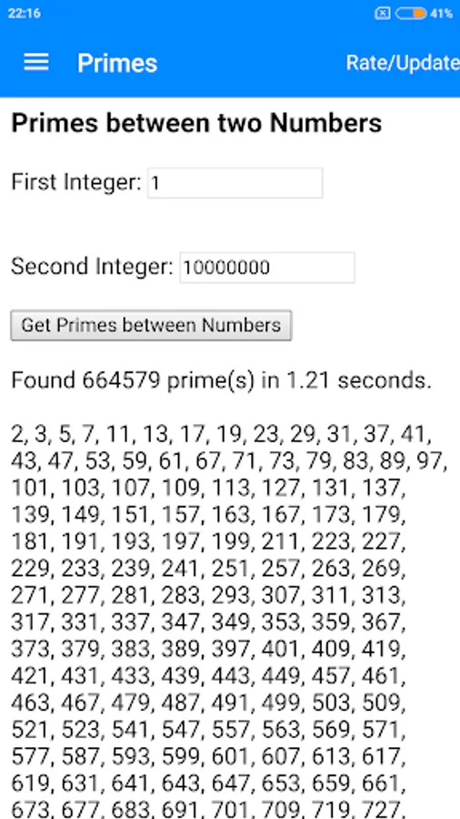 This app generates the list of primes between any two given numbers. The algorithm is optimized for android devices. It might be the fastest algorithm for generating primes on android smartphones. It can generate list of primes up to 30000000.