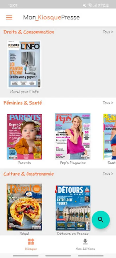With the Mon Kiosque Presse app, get unlimited access to more than 8 titles to read whenever you want: Thank you for the info, Parents, Health Magazine, Regal, Detours in France, Maison Créative, Détente Jardin, More of Peps. Take advantage of a 100% digital subscription: reading available on computer, tablet or mobile.