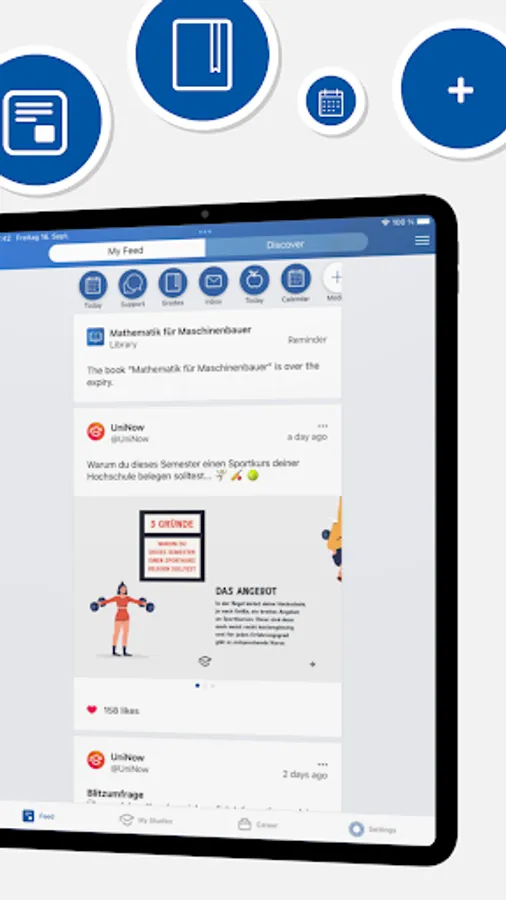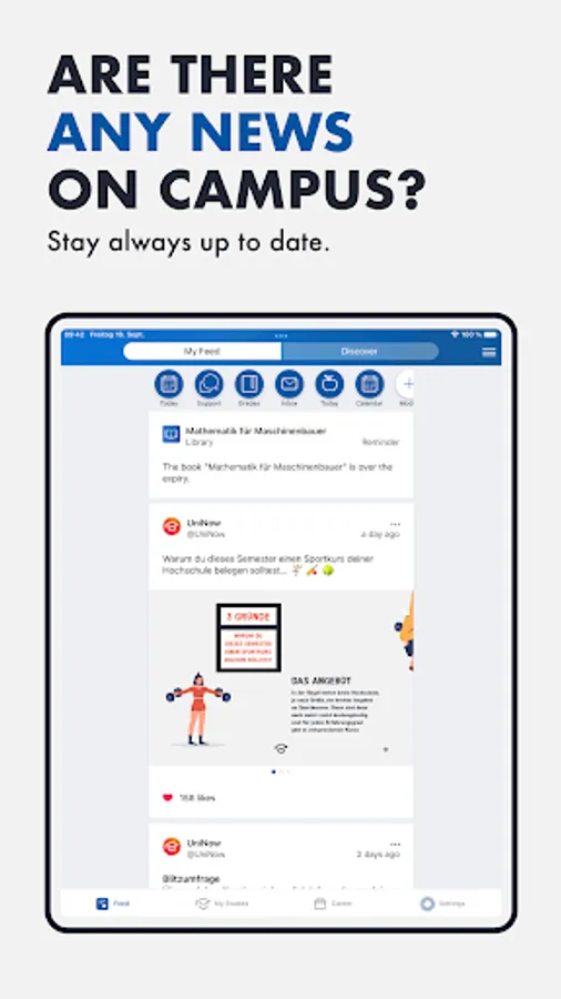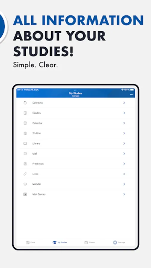 Everyday university life is exhausting enough, don't waste your time fighting through the confusing portals of the university. The app offers you everything you need to start every day well prepared, no matter if you have just started your studies or are already in your master's program.
