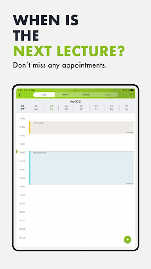 Calendar: The best thing to do is to start managing your schedule with the calendar. This way you have an overview of all your appointments and never miss a lecture or other important events again.
