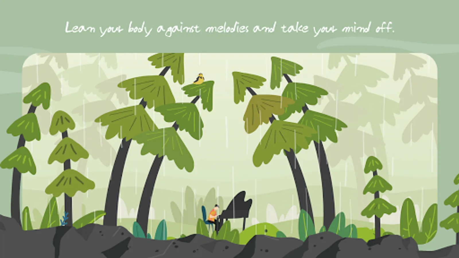 The sound of ocean waves, the motion of forest, the chirping of birds, and the sound of your footsteps. Capturing all of these from the site, we offer you the scenery and the sound in the form of beautiful illustrations and piano melodies.