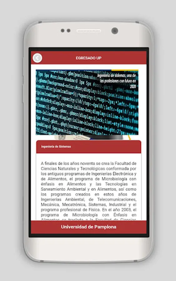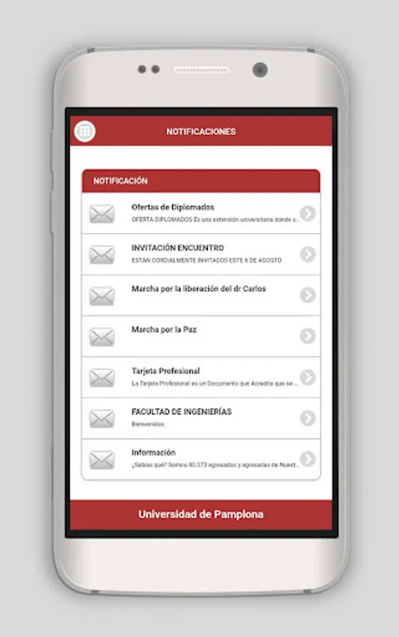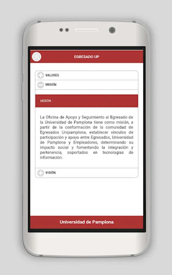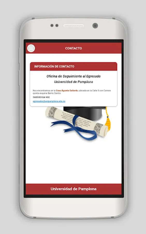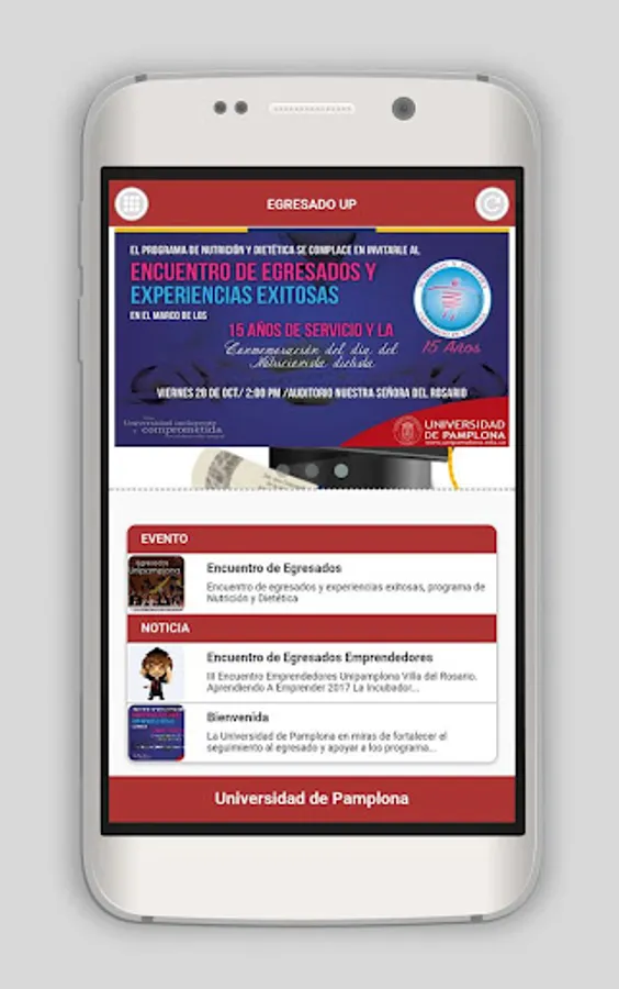 Pamplona University offers this mobile application allowing maintaining contact with our graduates, informing them of the schedule of events, news of the institution and the benefits to which they are entitled to be graduated from our University of Pamplona.