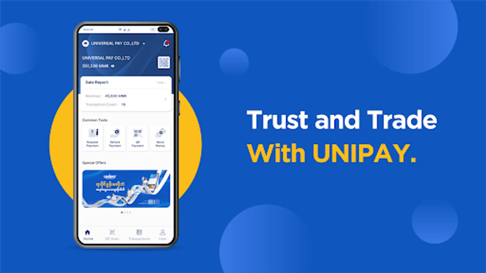 UniPay for Merchant is an APP for merchants to receive money from both local and overseas users. Merchants receive money in MMK while users pay in their local currencies.