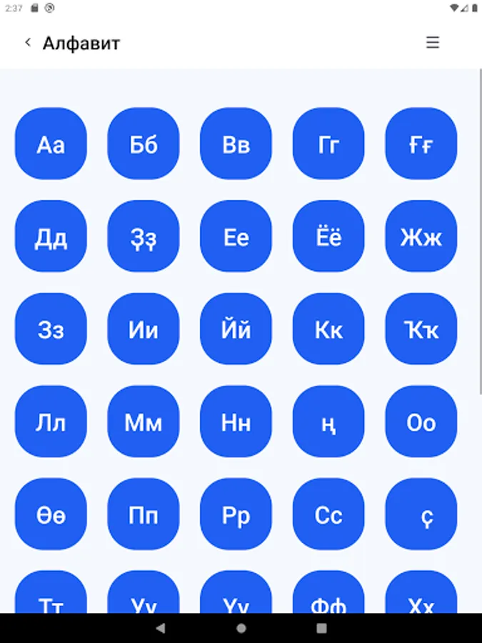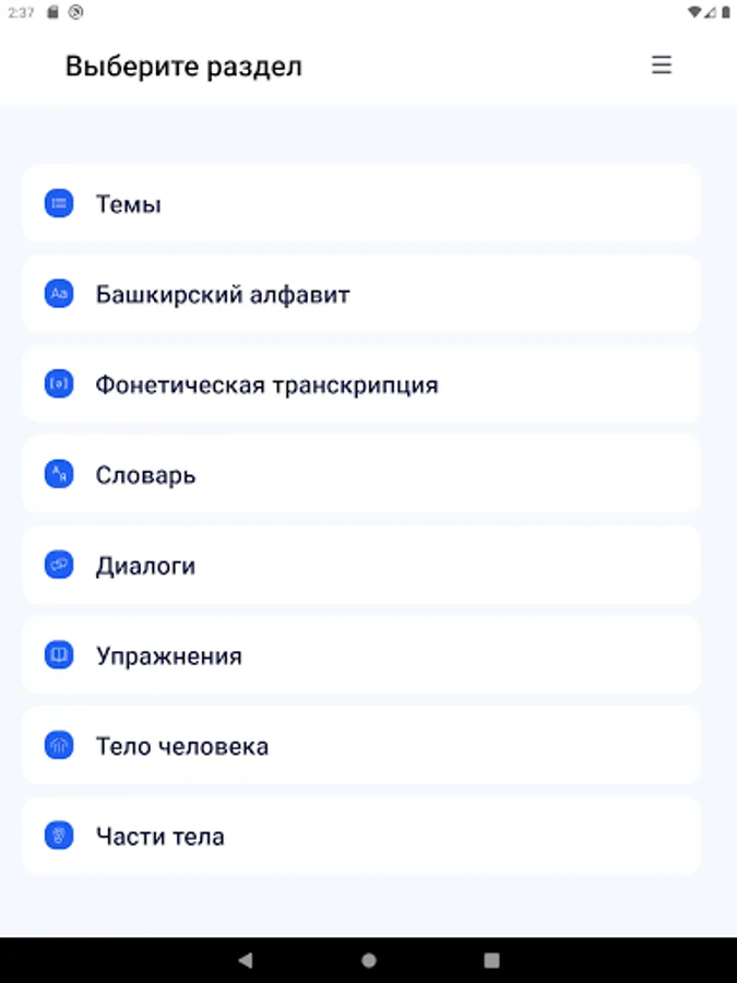 health and more than 2,000 set phrases. To expand the vocabulary in the application, there is a dictionary of common vocabulary with the possibility of a translator. To master the basics of pronunciation of specific sounds of the Bashkir language, the section “Phonetic transcription” has been developed with interactive exercises for practicing