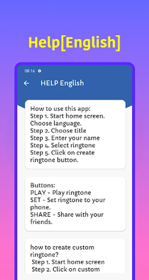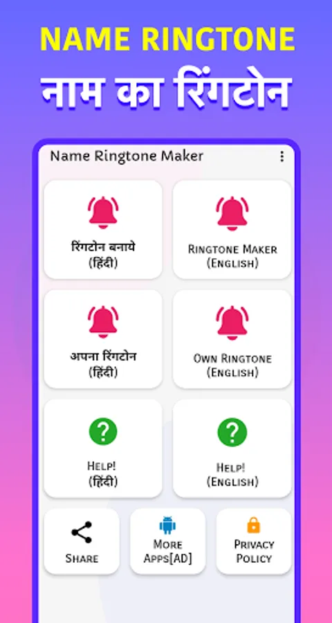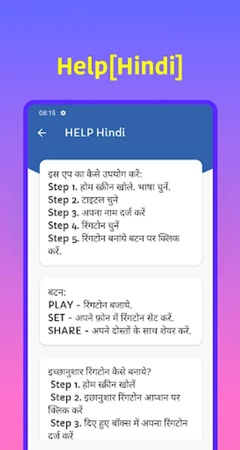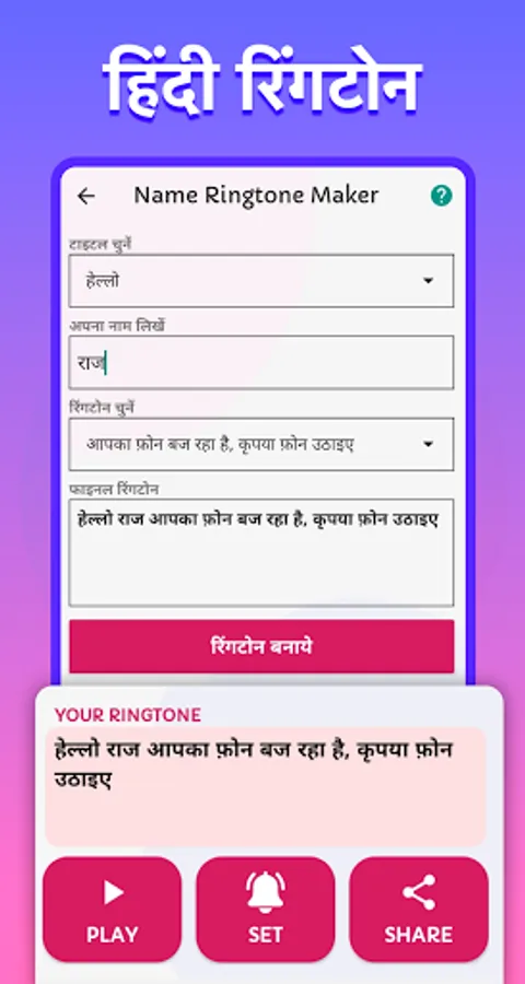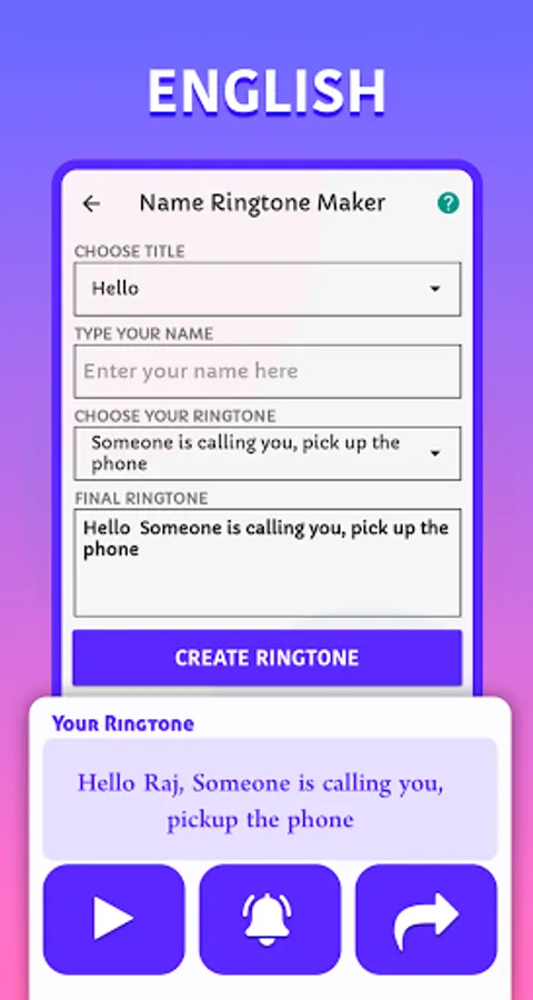 Just open this app and choose your language. Enter your name and select ringtone. Click on play button to listen and click on set to set the ringtone.