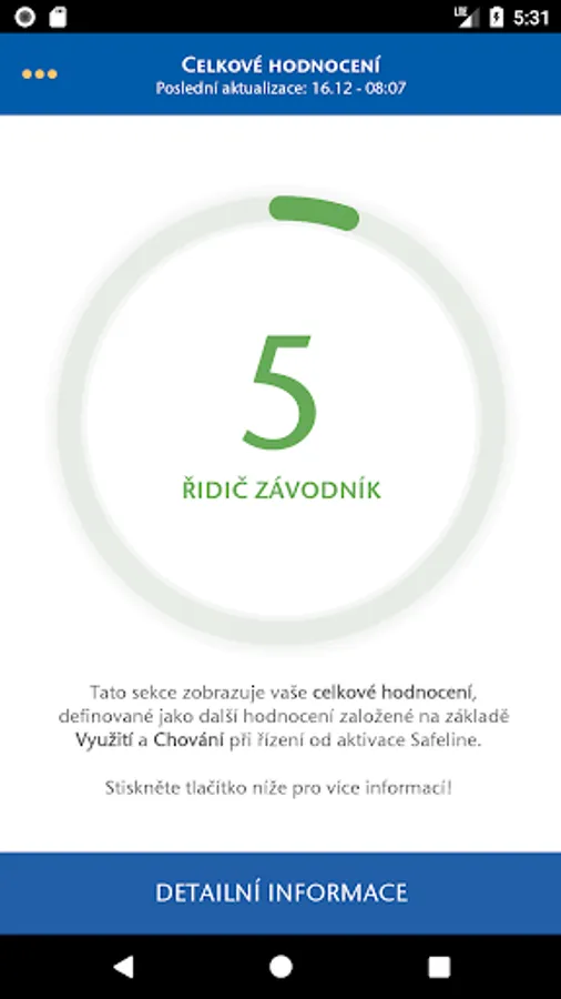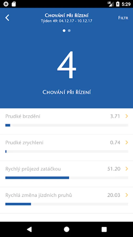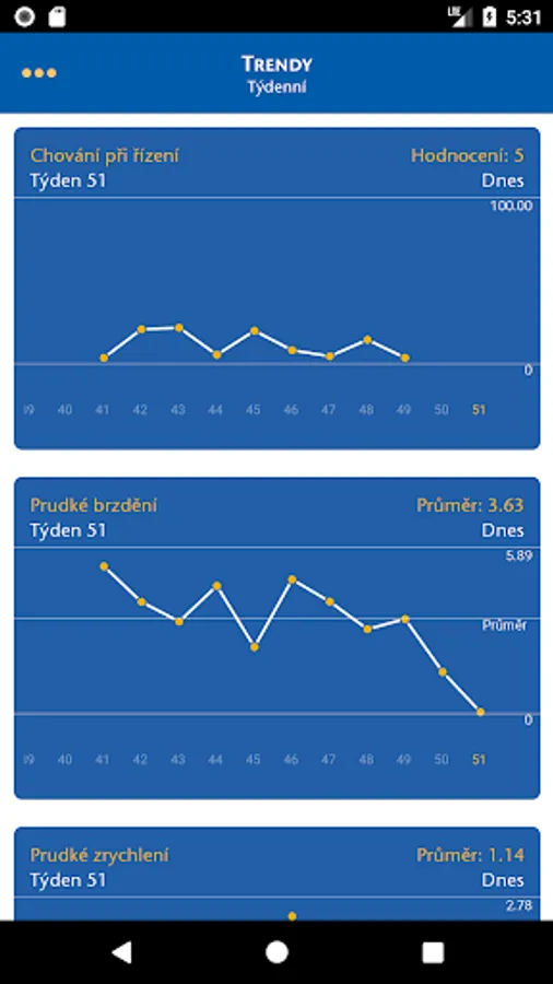 Driver behavior is the weekly ratings from 0 to 100 and represents the overall dynamic driving style, the "0" represents a highly dynamic style (0-30 is "Driver Racer") and "100" represents the calm and prudent management style (80-100 is " Řidič gentleman ").
