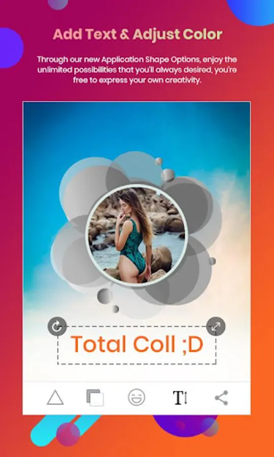 - Now a days Tag line or Text feature is most popular thing, so you can add your text on the image and also resize text, change text color, change text position with finger and change different text styles.