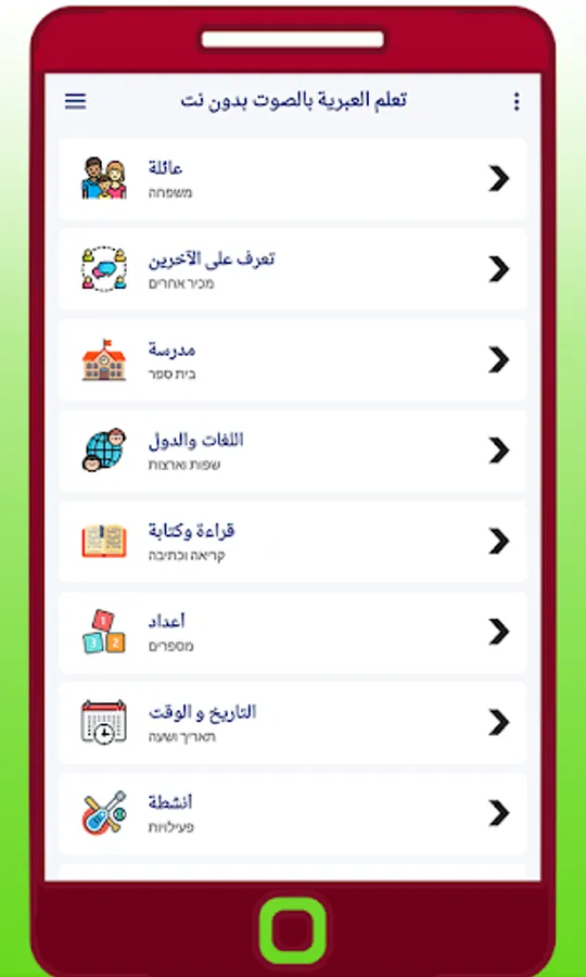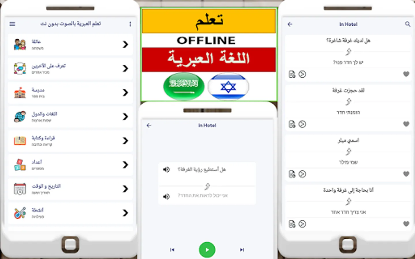 تعلم العبرية بالصوت بدون نتمجانا لجميع المستخدمين. يمكنك تعلم الجمل والعبارات المعقدة في وقت قصير تعلم العبرية بالصوت التطبيق مفيد لرجال الأعمال والمسافرين لتعلم أساسيات اللغة الأجنبية. يمكن للمستخدمين تعلم اللغة العبرية وأسهل وأفضل طريقة لتعلم الأبجدية العبرية وقواعد اللغة للمبتدئين. تعلم العبرية بسهولةهو أيضا مفيد لتعلم الأفعال والمفردات. إنها تعمل بكفاءة على الإنترنت كما تعمل بشكل غير متصل.