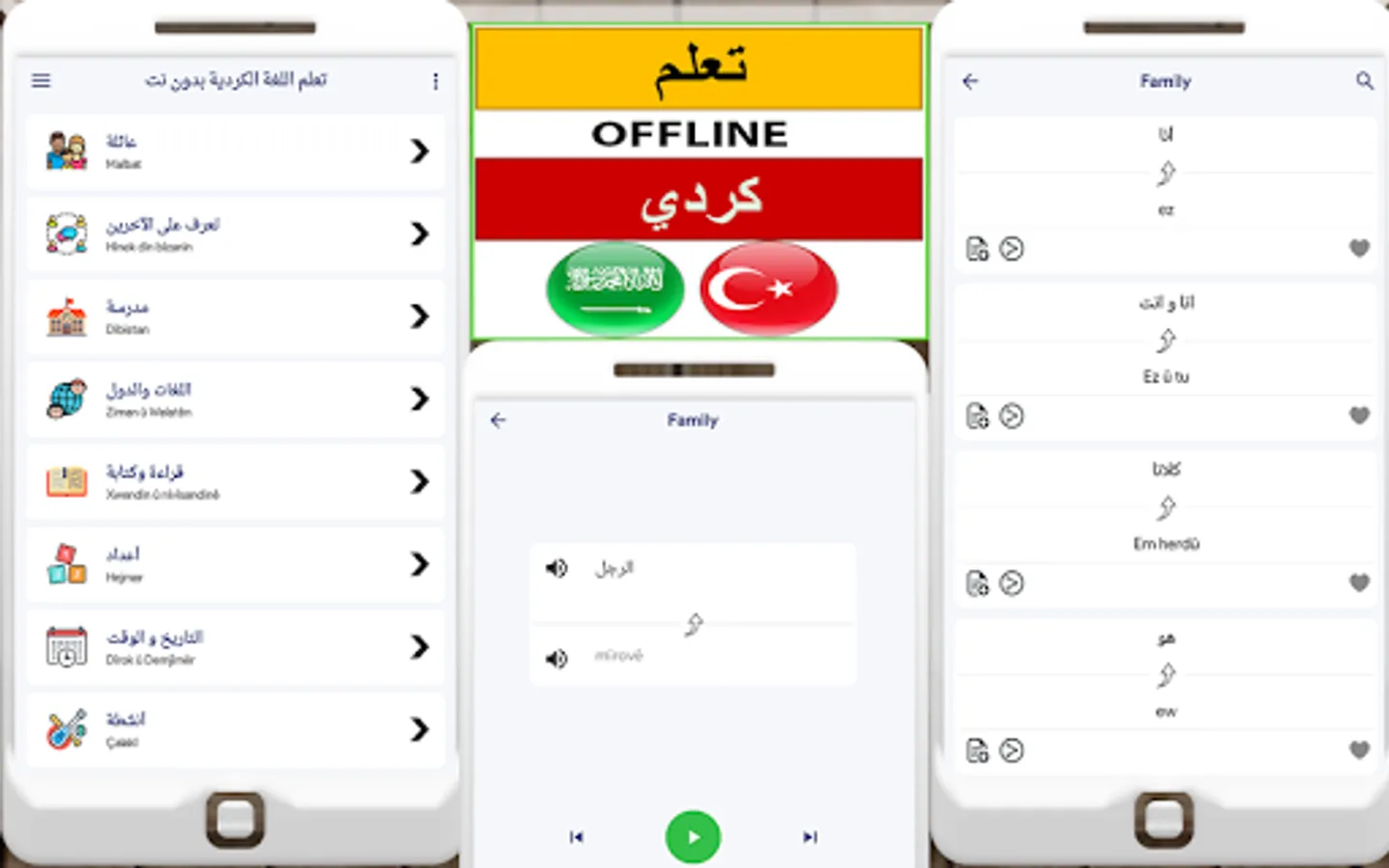 تعلم الكرديةمجانا لجميع المستخدمين. يمكنك تعلم الجمل والعبارات المعقدة في وقت قصير تعلم اللغة الكرديةالتطبيق مفيد لرجال الأعمال والمسافرين لتعلم أساسيات اللغة الأجنبية. يمكن للمستخدمين تعلم اللغة الكردية وأسهل وأفضل طريقة لتعلم الحروف الأبجدية الكردية وقواعد اللغة للمبتدئين. تعلم لغة الكرديةهو أيضا مفيد لتعلم الأفعال والمفردات. إنها تعمل بكفاءة على الإنترنت كما تعمل بشكل غير متصل.