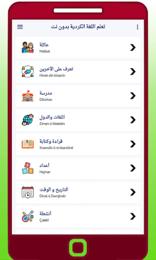 Kurdî fêr bibin Ji bo hemî bikarhêneran belaş e. Hûn dikarin di tu deman de hevokan û hevokan tevlihev fêr bibin. Zimanê Kurdî hîn bibin app ji bo karsaz û rêwîtiyan kêrhatî ye ku bingehên zimanê biyanî fêr bibin. Bikarhêner dikarin bi zimanê kurdî fêr bibin û awayê wê herî hêsan û çêtirîn ji bo fêrbûna alfabeyên Kurdî û rêzimana ji bo destpêkan. Zimanê Kurdî hîn bibin her weha ji bo fêrbûna verb û Vokabularyê jî arîkar e. Ew di moda online û hem jî moda xerîdar de bi profesyonelî dixebite.