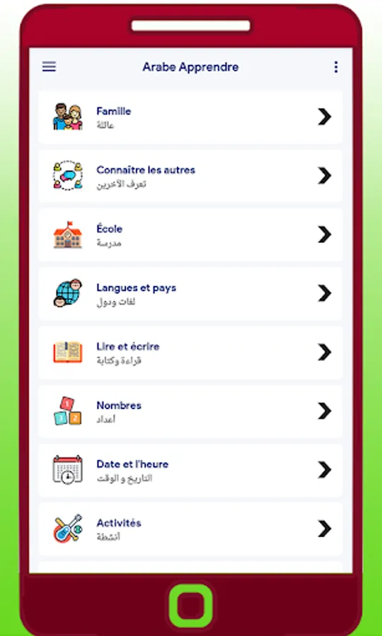 Arabe Français est Gratuit pour tous les utilisateurs. Vous pouvez apprendre des phrases et des phrases complexes en un rien de temps. Arabe Alphabet l'application est utile pour les hommes d'affaires et les voyageurs d'apprendre les rudiments de la langue étrangère. Les utilisateurs peuvent apprendre la langue italienne et sa meilleure façon d'apprendre les alphabets italiens et la grammaire pour les débutants. Arabe Apprendre est également utile pour apprendre les verbes et le vocabulaire. Il fonctionne efficacement en ligne ainsi que hors ligne.