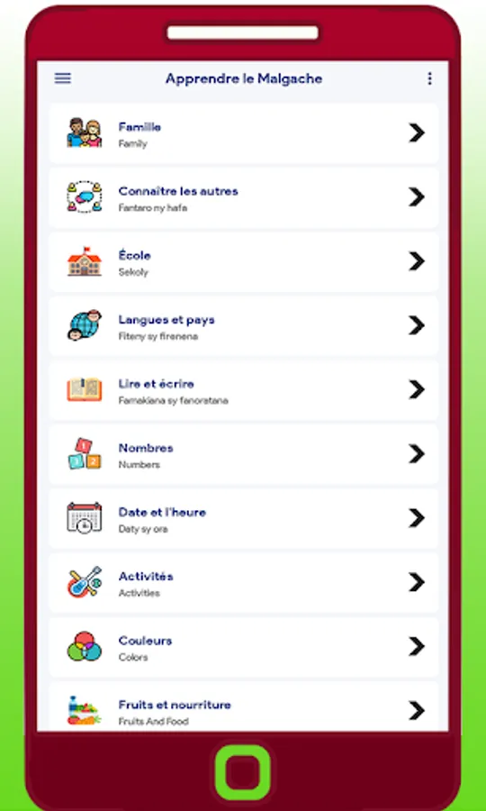 Malagasy tena manana lafiny tsotra sy mora ampiasaina. Malagasy Francais dia tsara indrindra fampiharana ny hianatra ny teny Malagasy nerlandey ho an'ny beginners. Afaka mianatra momba ny voankazo sy ny legioma anarana haingana. Ianao dia afaka mora foana ny hianatra iraisana ny andian-teny albaney sy ny fototra abidy.