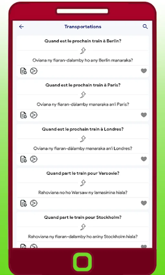 Malgache Francais est Gratuit pour tous les utilisateurs. Vous pouvez apprendre des phrases et des phrases complexes en un rien de temps. Vocabulaire Francais Malgache l'application est utile pour les hommes d'affaires et les voyageurs d'apprendre les rudiments de la langue étrangère. Les utilisateurs peuvent apprendre la langue malgache et sa meilleure façon d'apprendre les alphabets Malgaches et la grammaire pour les débutants. Proverbe Malgache est également utile pour apprendre les verbes et le vocabulaire. Il fonctionne efficacement en ligne ainsi que hors ligne.
