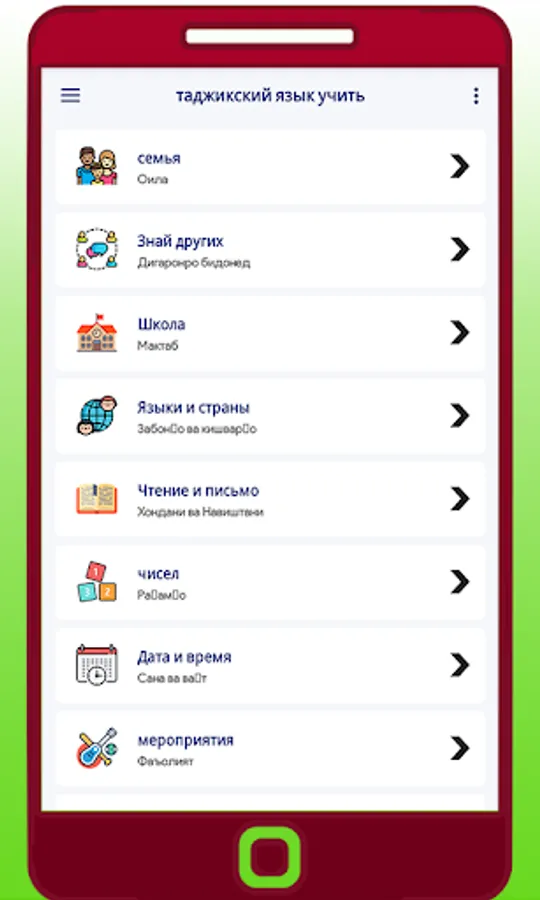таджикский игра имеет очень простые функции и прост в использовании. выучить таджикский язык это лучшее приложение для изучения таджикского произношения для начинающих. Вы можете быстро узнать о названиях фруктов и овощей. Вы можете легко выучить общие фразы произношения и основы алфавитов. выучить таджикский язык приложение потребляет меньше места в вашем мобильном телефоне.
