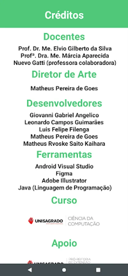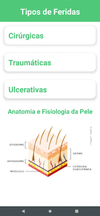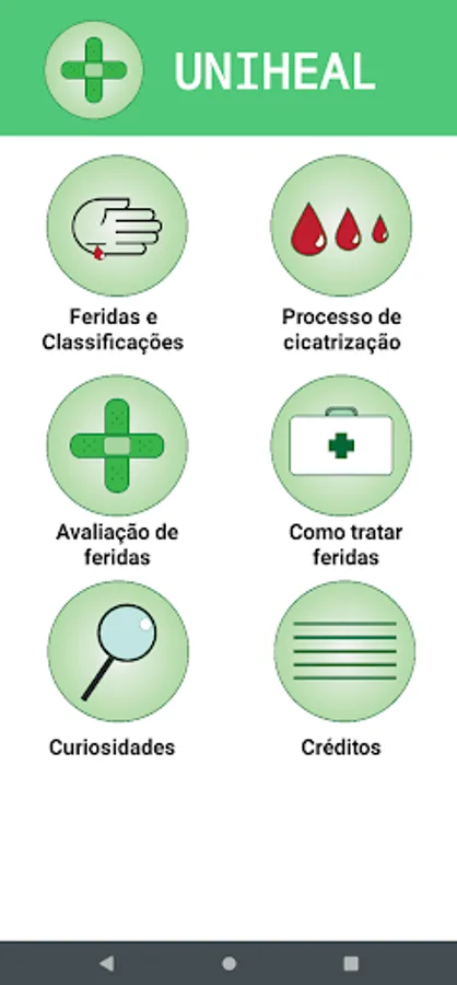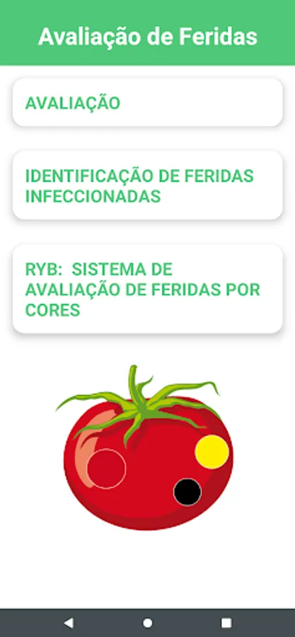 App for assessment and treatment of wounds. The purpose of the application is to provide a brief presentation about wounds to the target audience and teach how to treat them. The target audience consists of lay people in the health area, being directed to all audiences. The tools used in the construction of the project were Android Studio, Figma, Adobe Illustrator and the Java programming language.