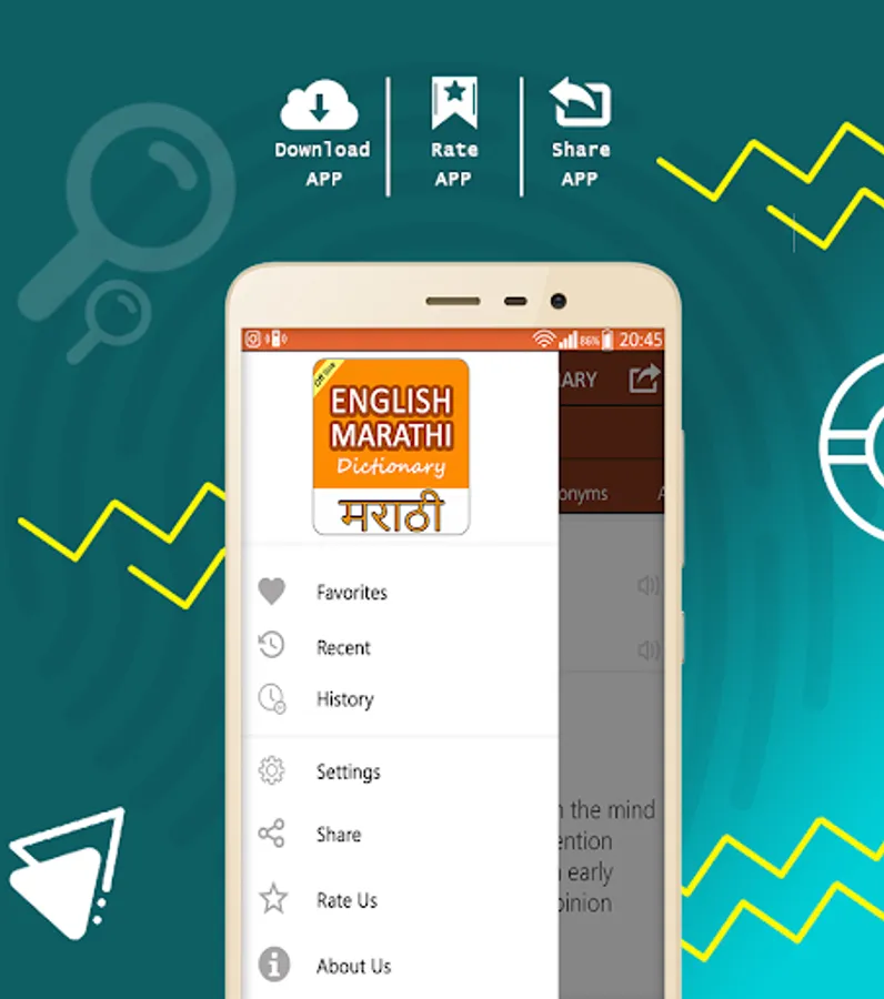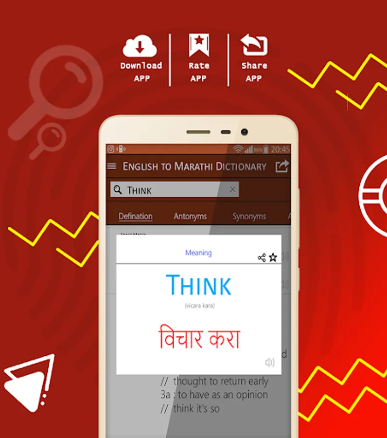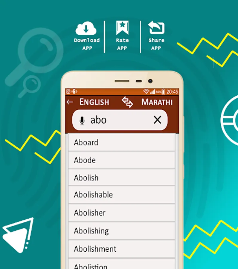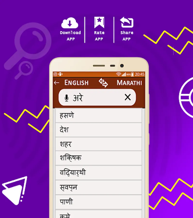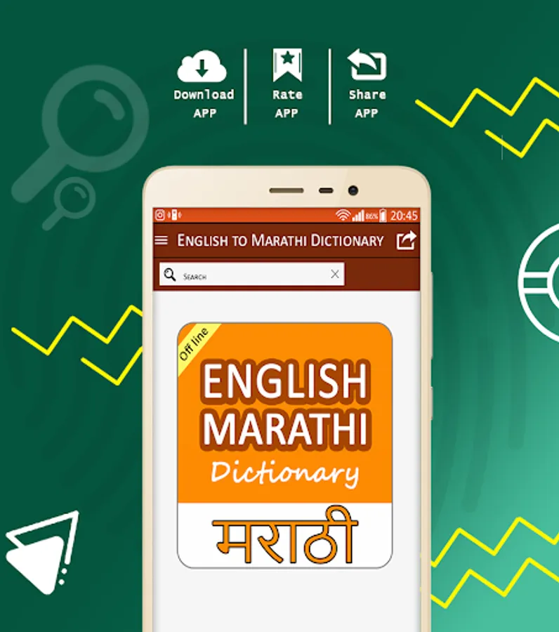 English to Marathi dictionary is a complete learning tool for the people who want to learn English from Marathi or Marathi from English. This dictionary has a very big database of both English and Marathi Wods and sentences. This app contains thousands of words, phrases and daily use sentences both in English and Marathi Languages. This app also has a choose option for being easy to use. You can select words of your choice by the way to auto suggestion box.