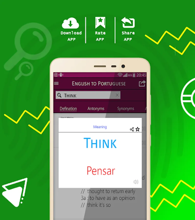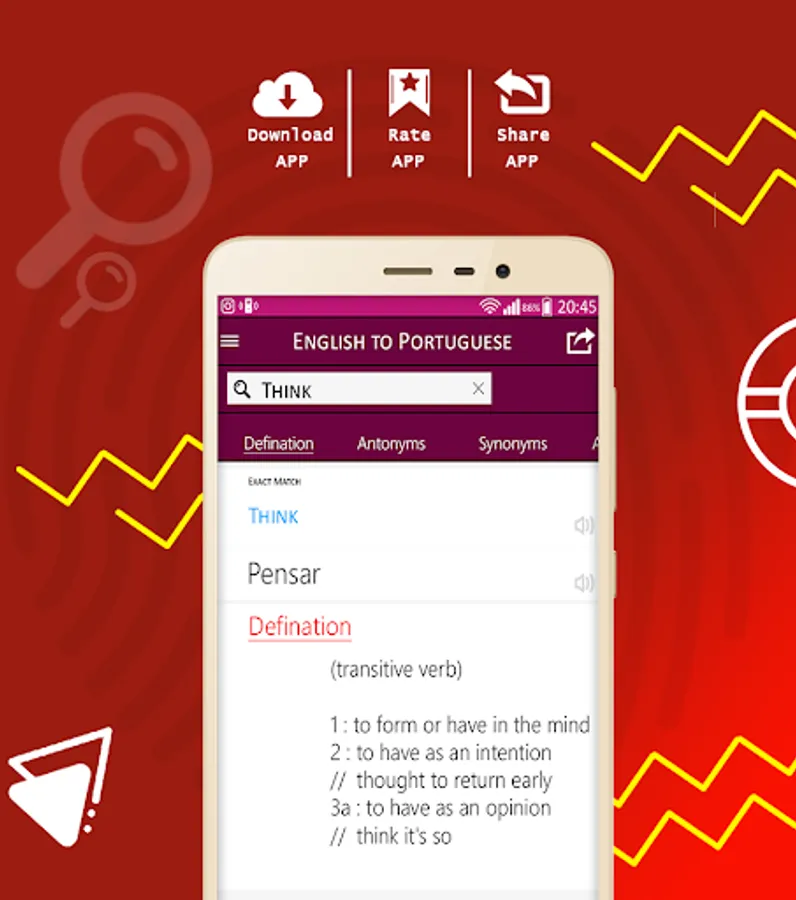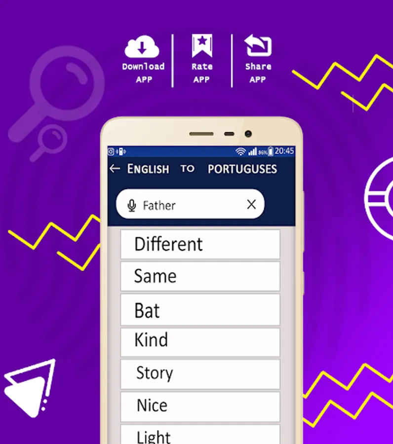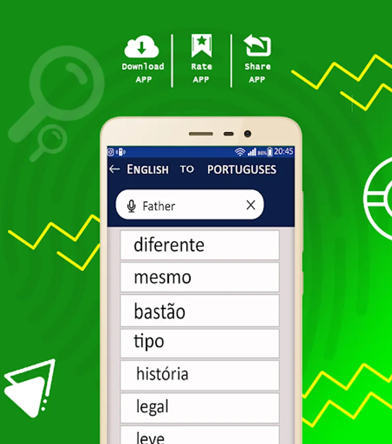 Offline English Portuguese Dictionary is useful for all users who want to find meanings and learn English Language. You can translate words and find their meanings. You can also translate words from clipboard. This application gives the common functionality of English to Portuguese words meanings.