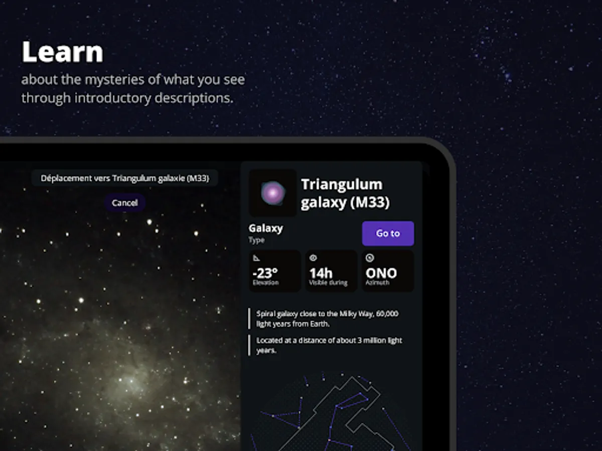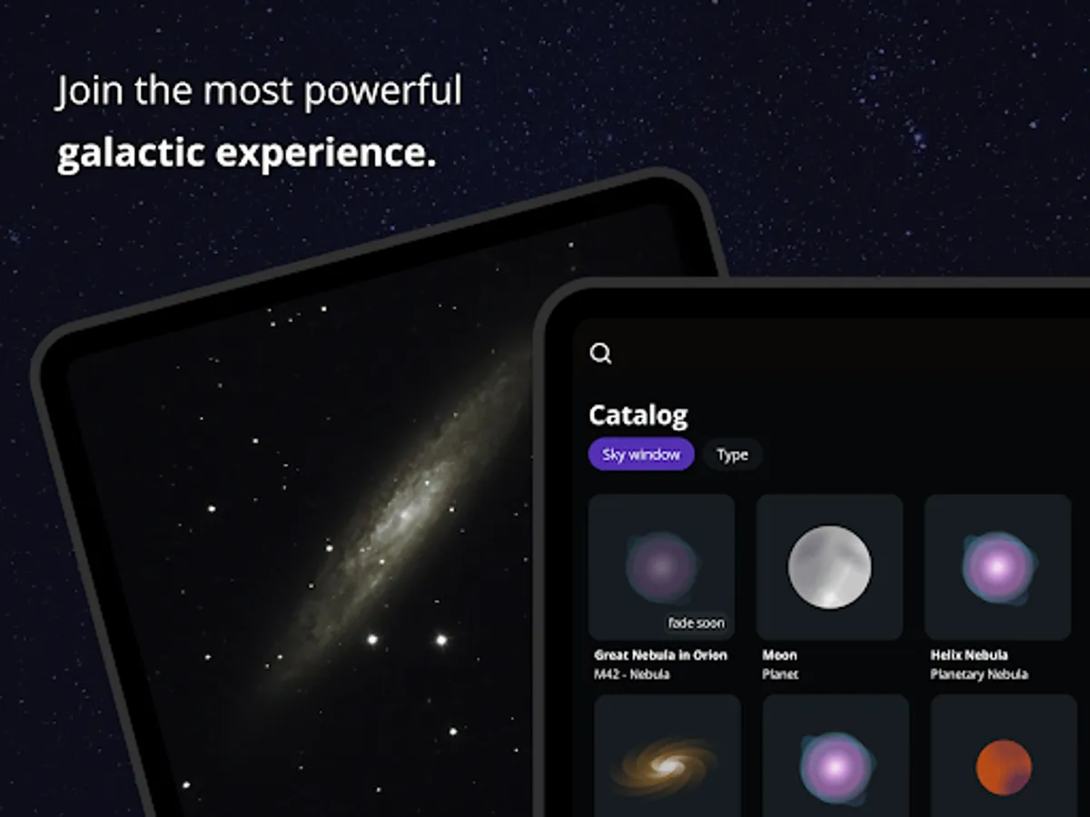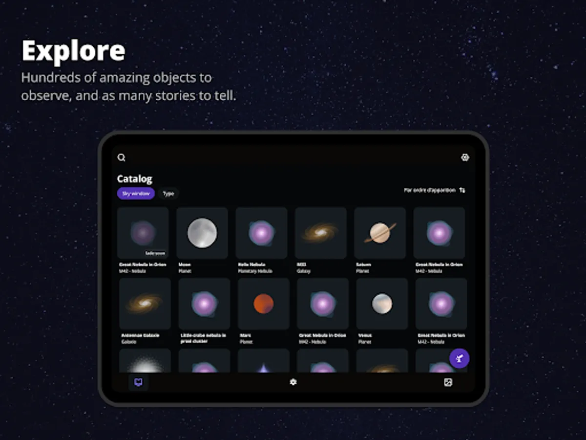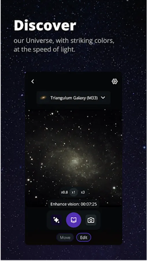 Explore the night sky : Choose an object (galaxies, nebulae, star and more) on the app and observe it, live. The Unistellar eVscope does all the pointing and tracking autonomously. Through the app, you can also set up your sky observation window.