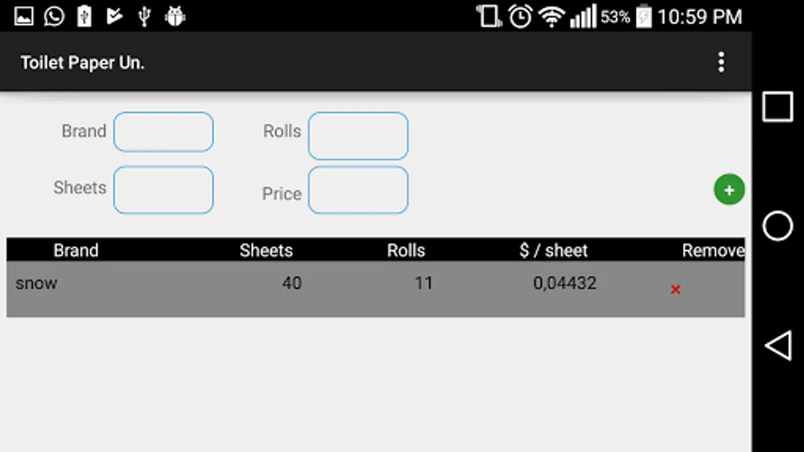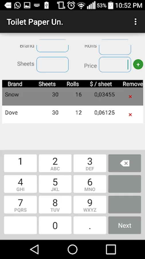Enter the values in the fields, click in the '+' and the Toilet Paper will be added to the list, where the cheapest one is highlighted.