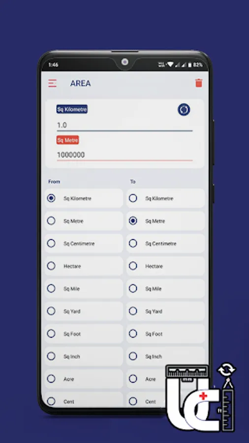 * Area (Square kilometer, square meter, square centimeter, Hectare, square mile, square yard, sq foot, sq inch, acre)